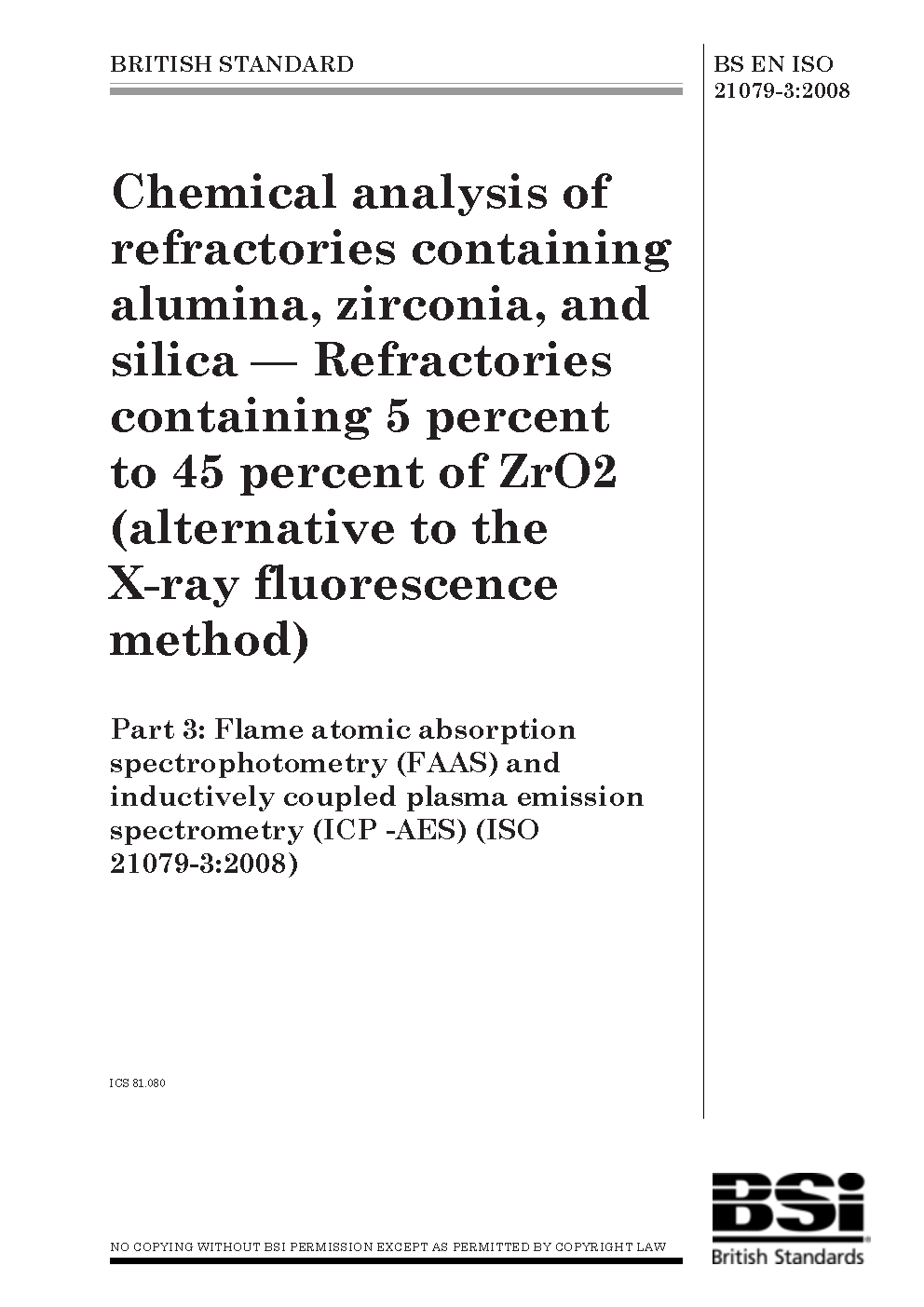 Chemical analysis of refractories containing alumina, zirconia, and silica. Refractories 5 percent to 45 ZrO2 (alternative the X-ray fluorescence method) Flame atomic absorption spectrophotometry (FAAS) inductively coupled plasma emission spectrometry (ICP-AES)