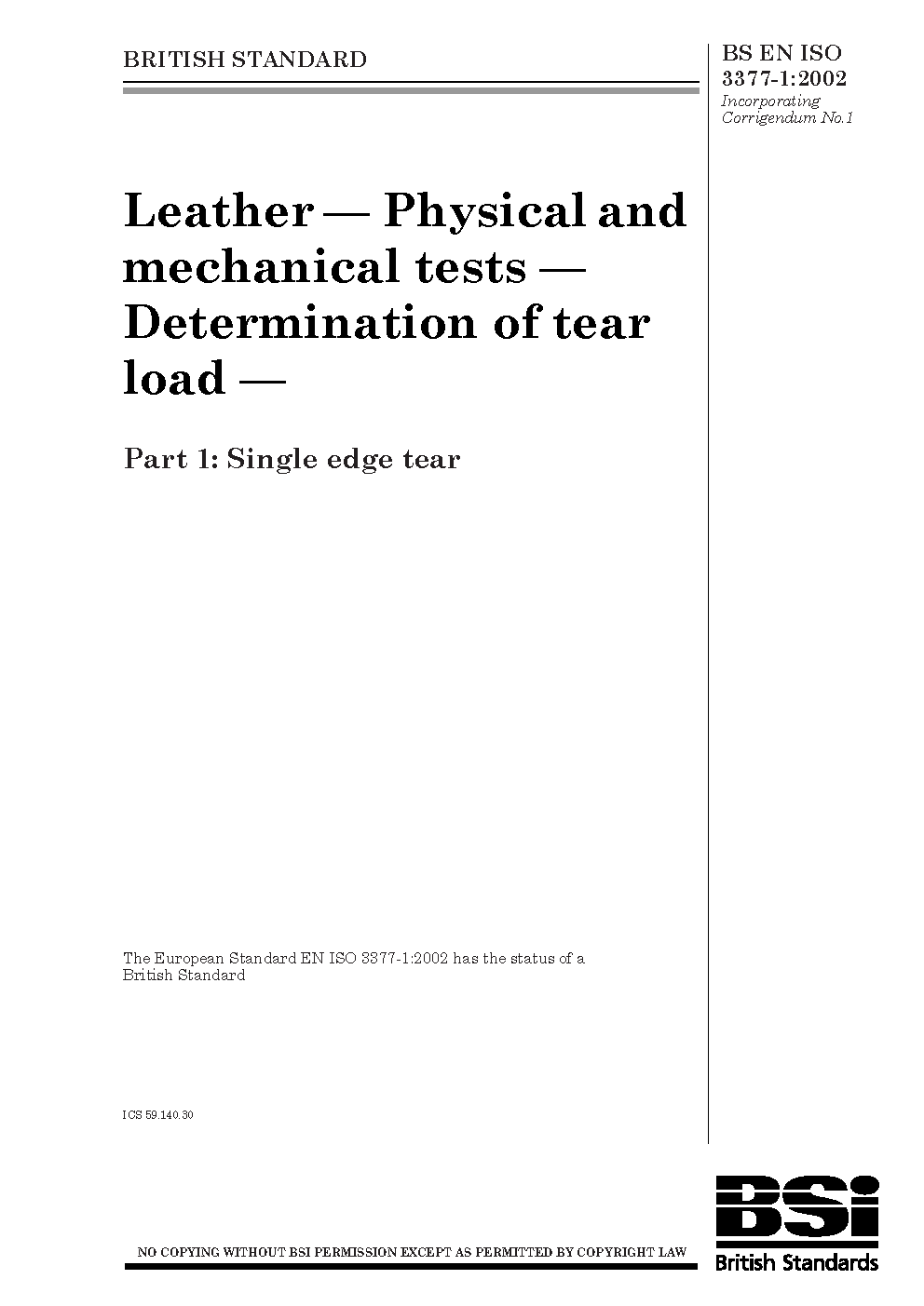Leather. Physical and mechanical tests. Determination of tear load Single edge