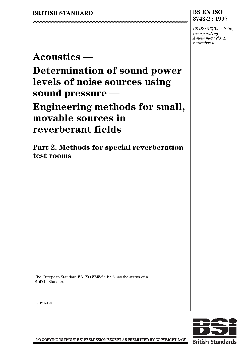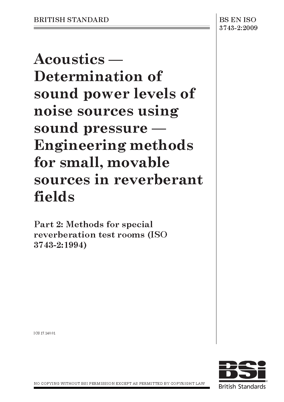 Acoustic testing rooms;Acoustics;Testing conditions;Sound sources;Acoustic testing;Reverberation;Reverberation rooms;Acoustic measurement;Calibration;Measurement characteristics;Mathematical calculations;Installation;Test equipment;Sound intensity;Reproducibility;Noise (environmental)