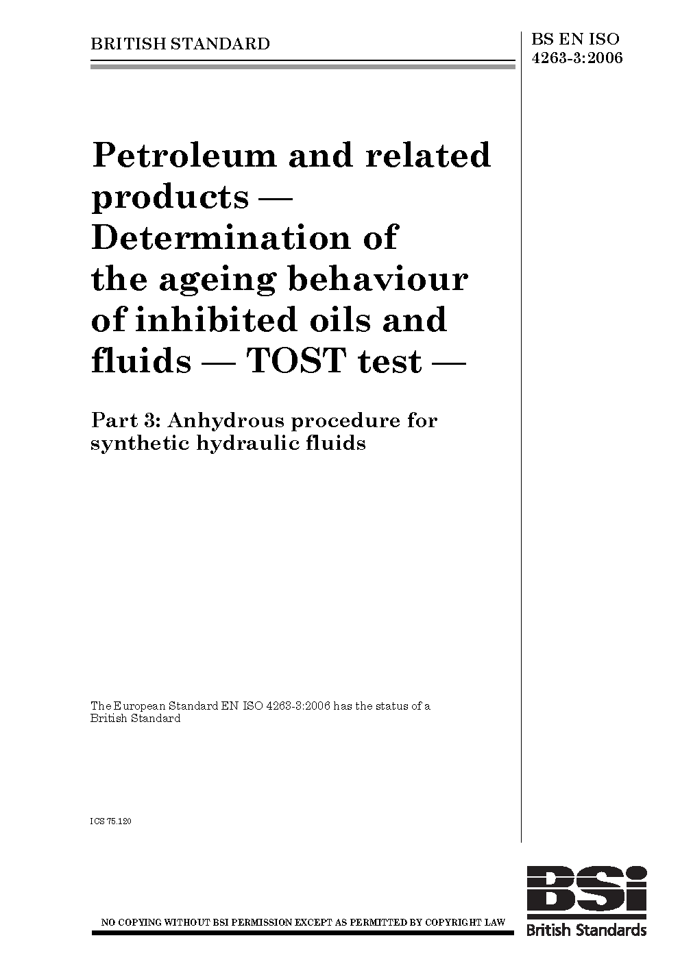 Petroleum and related products. Determination of the ageing behaviour inhibited oils fluids using TOST test Anhydrous procedure for synthetic hydraulic