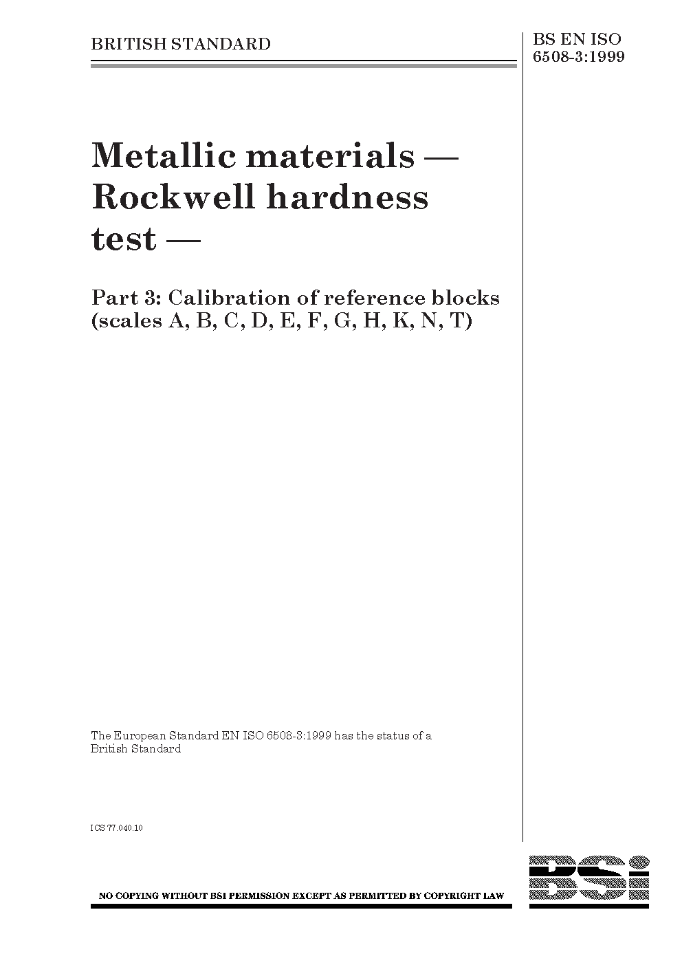 Metallic materials. Rockwell hardness test Calibration and reference blocks (scales A, B, C, D, E, F, G, H, K, N, T)