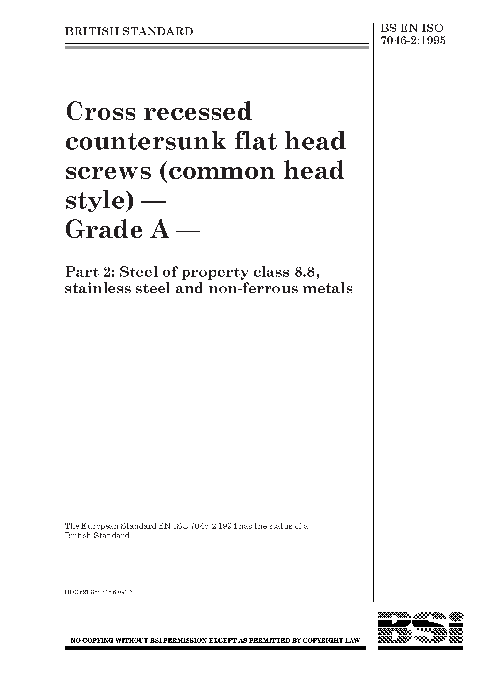 External-thread fasteners;Countersunk fasteners;Recessed-head fasteners;Cruciform-head fasteners;Designations;Stainless steels;Fasteners;Non-ferrous metals;Preferred sizes;Corrosion-resistant steels;Dimensional tolerances;Threaded fasteners;Grades (quality);Screws (bolts);Threads;Heads (fasteners);Dimensions