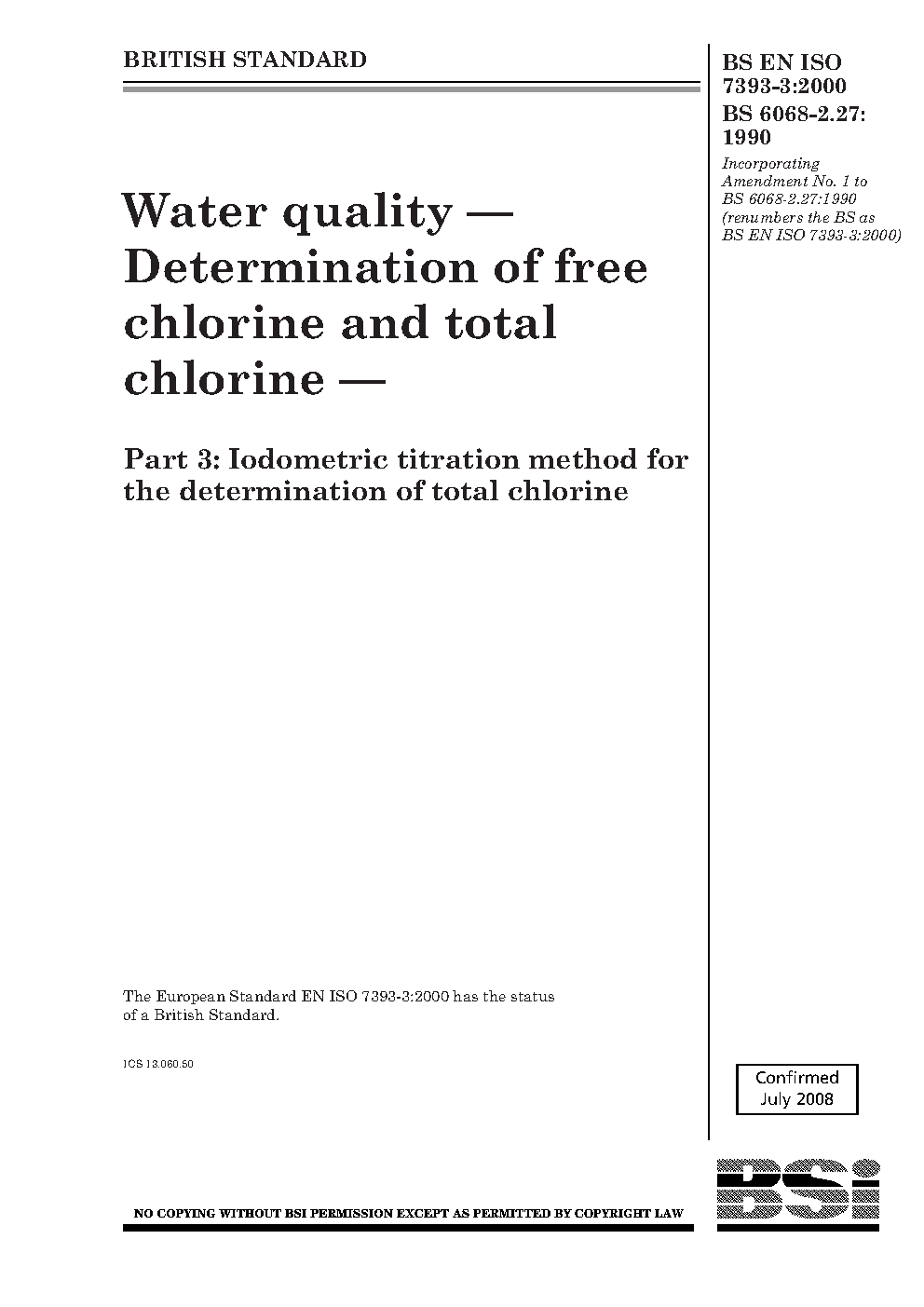 Water quality. Determination of free chlorine and total Iodometric titration method for the determination