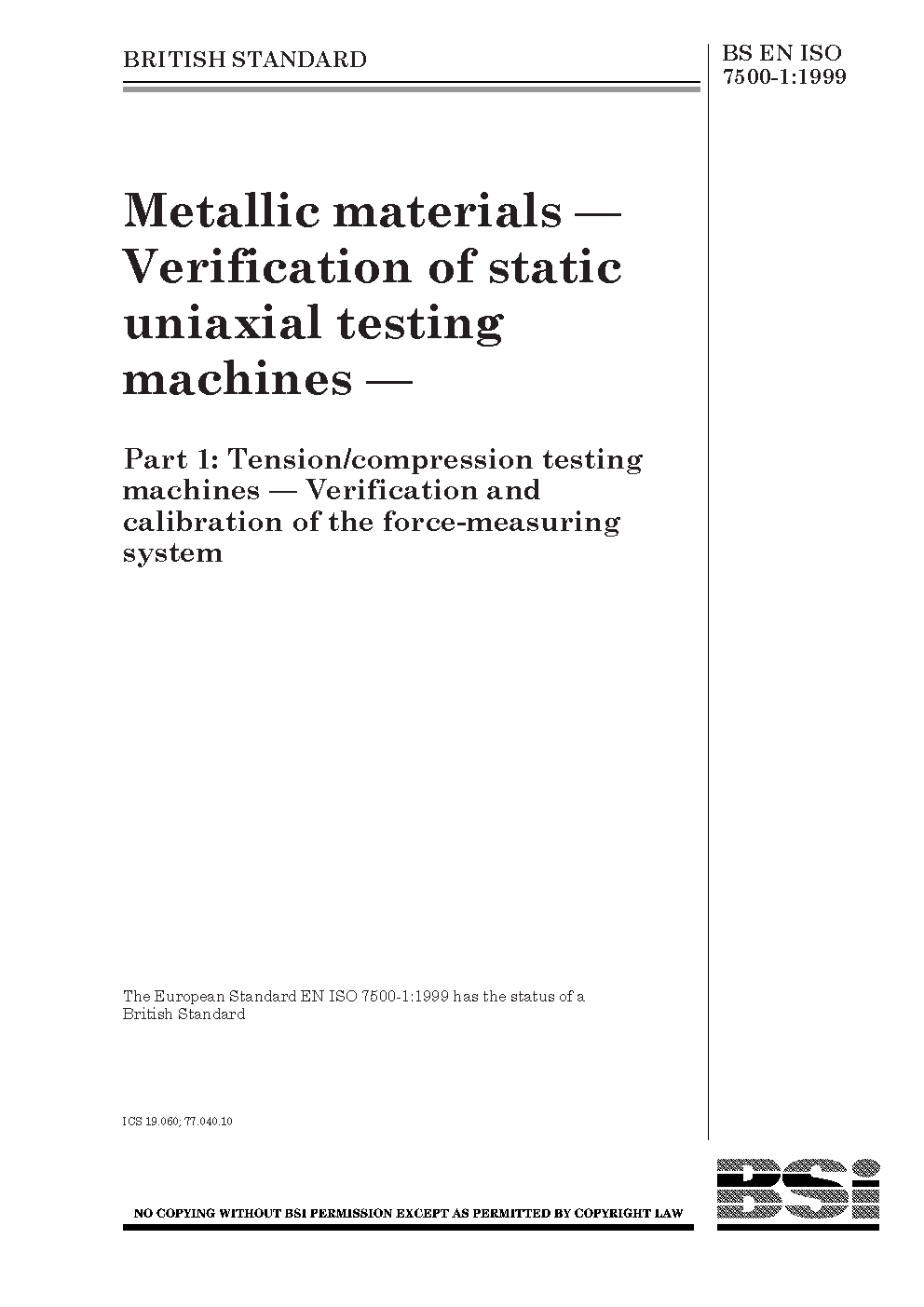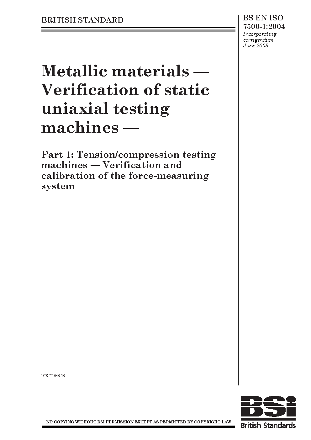Metallic materials. Verification of static uniaxial testing machines Tension/compression machines. and calibration the force-measuring system