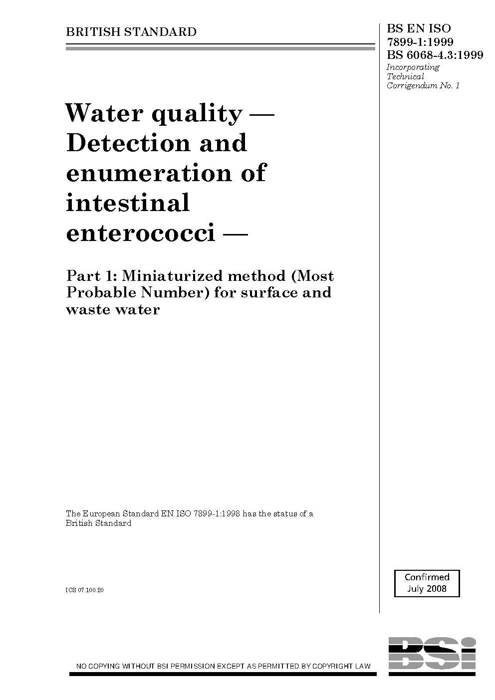 Water quality. Detection and enumeration of intestinal enterococci in surface waste water Miniaturized method (Most probable number) for