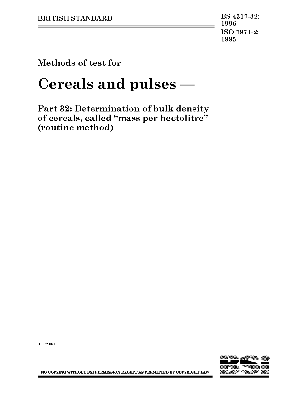Cereals. Determination of bulk density, called mass per hectolitre Routine method