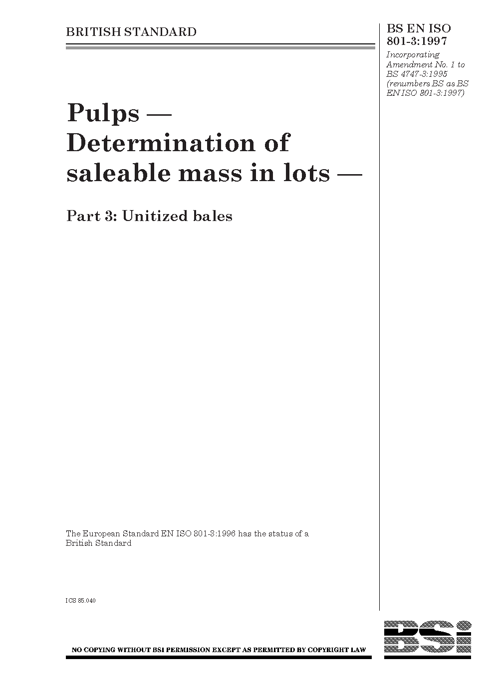 Paper pulp;Specimen preparation;Paper technology;Sampling methods;Bales;Reports;Sheet materials;Unit loads;Weight measurement;Dry weight determination;Test specimens