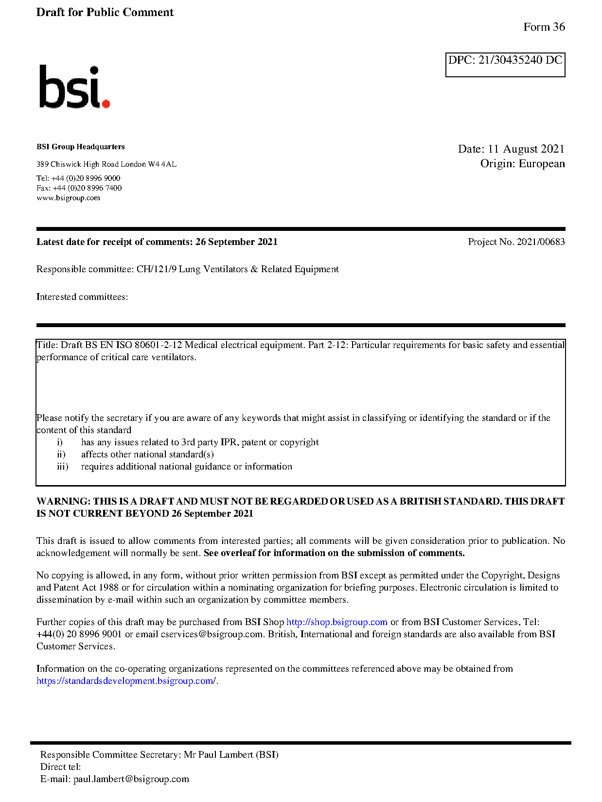 Medical electrical equipment Particular requirements for basic safety and essential performance of critical care ventilators
