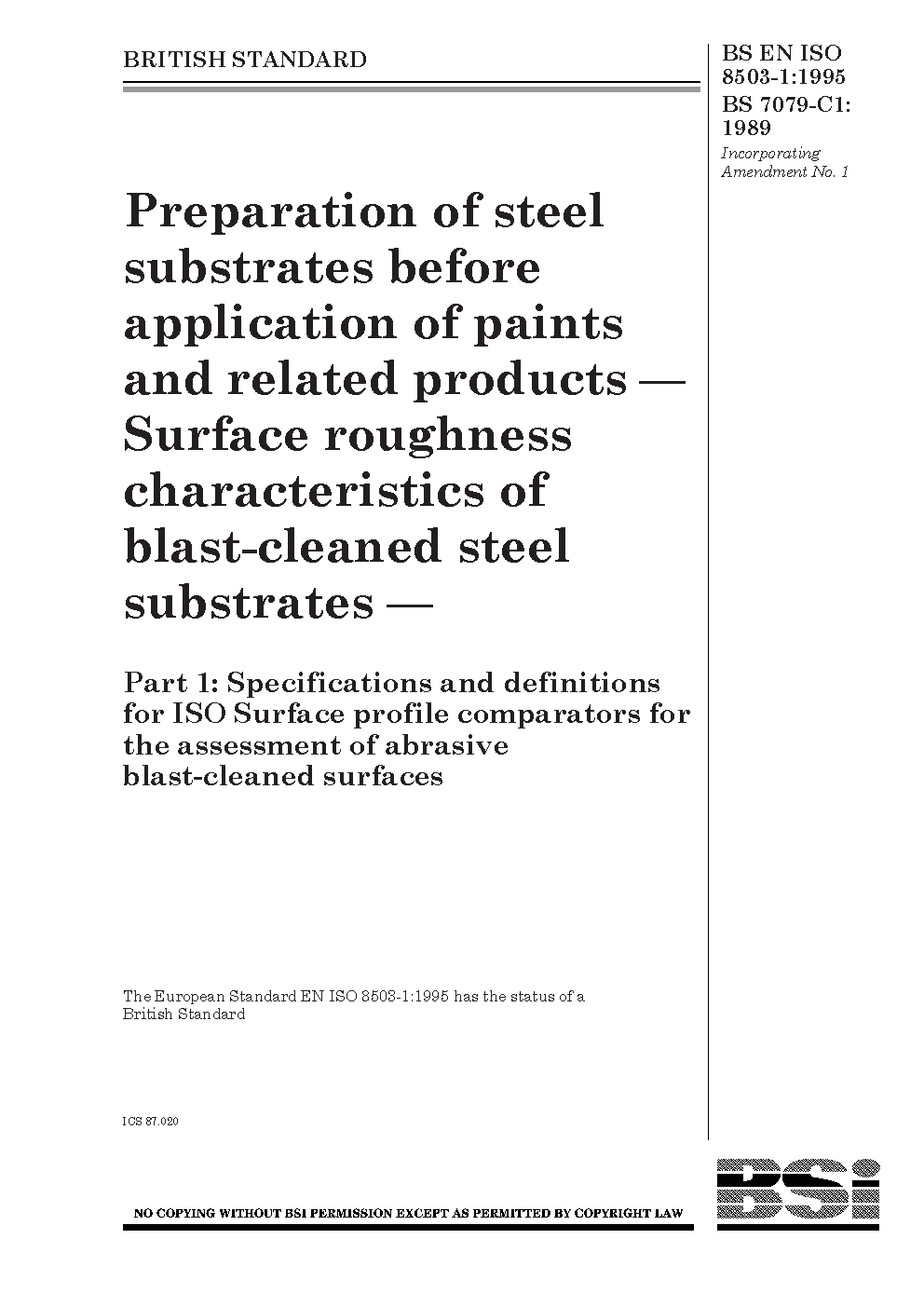 Preparation of steel substrates before application paints and related products. Surface roughness characteristics blast-cleaned Specifications definitions for ISO surface profile comparators the assessment abrasive surfaces