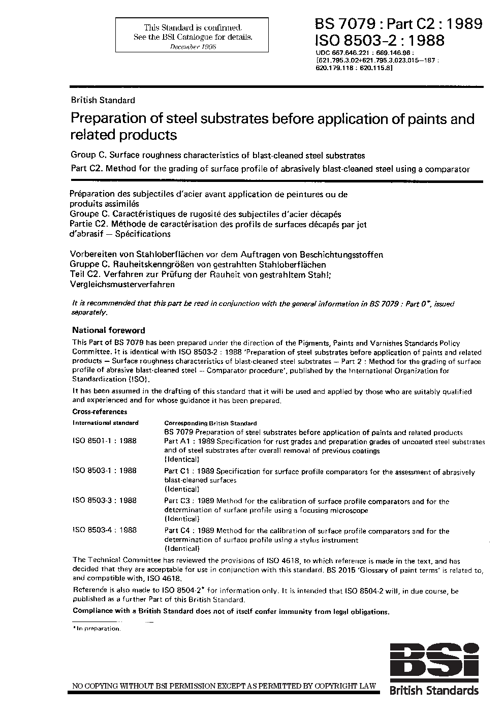 Surface properties;Grades (quality);Surface treatment;Abrasive processes;Mechanical cleaning;Profile measurement;Roughness (surface);Grading (quality);Comparative tests;Surfaces;Blast-cleaning;Surface-roughness measurement;Cleaning;Painting;Visual inspection (testing);Steels