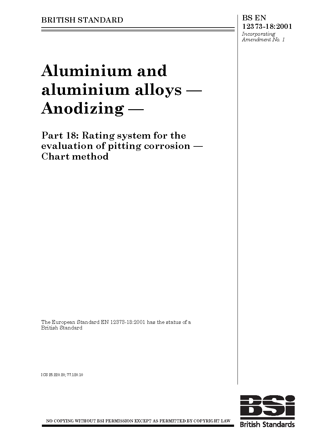 Anodizing of aluminium and its alloys. Rating system for the evaluation of pitting corrosion. Chart method