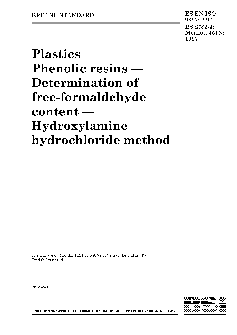 Plastics. Phenolic resins. Determination of free-formaldehyde content. Hydroxylamine hydrochloride method