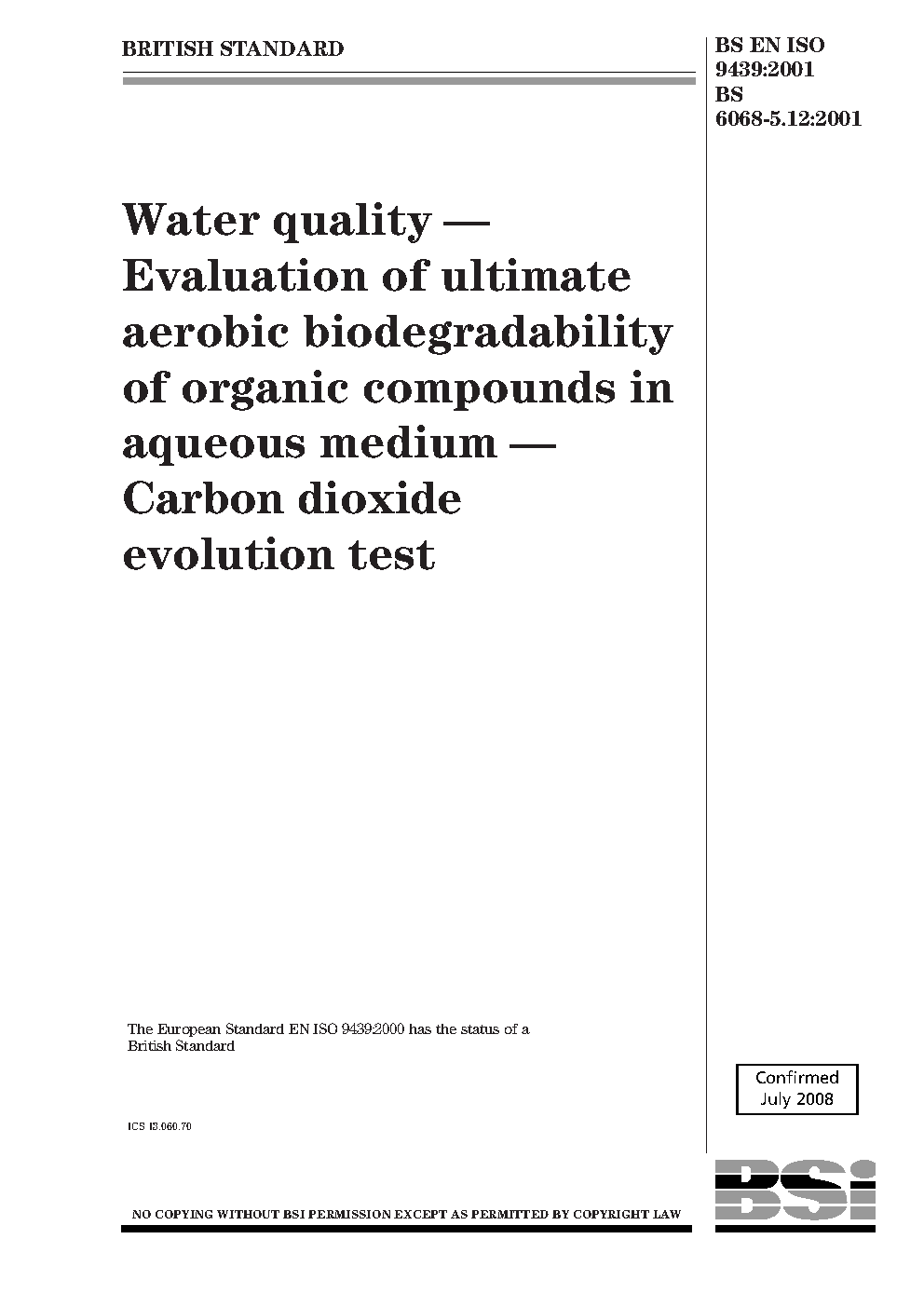 Water quality. Evaluation of ultimate aerobic biodegradability of organic compounds in aqueous medium. Carbon dioxide evolution test