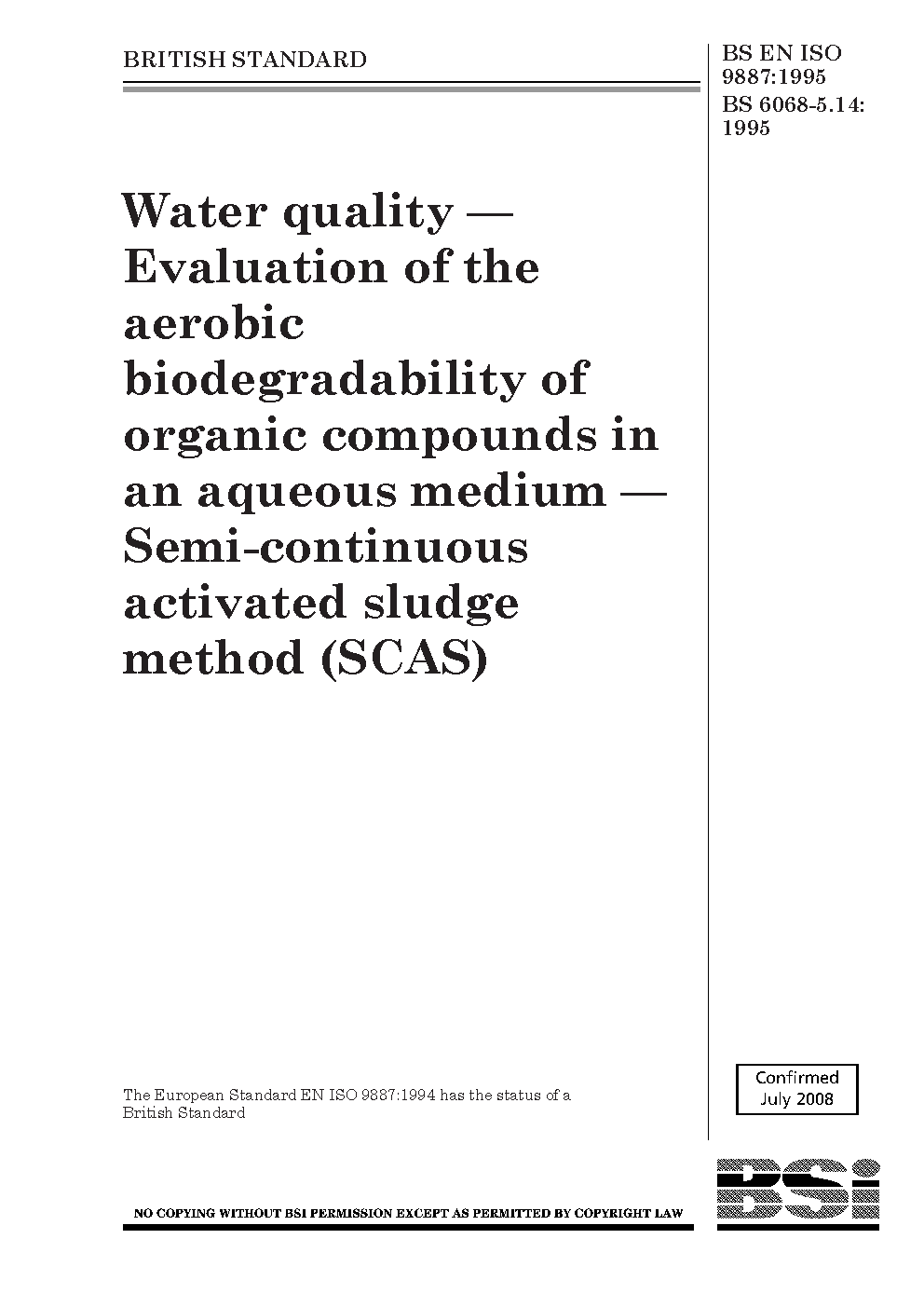Water quality. Evaluation of the aerobic biodegradability of organic compounds in an aqueous medium. Semi-continuous activated sludge method (SCAS)