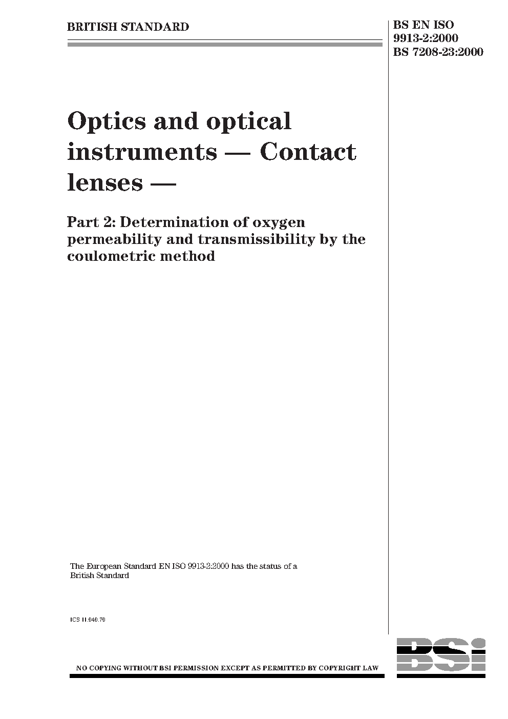 Optics and optical instruments. Contact lenses Determination of oxygen permeability transmissibility by the coulometric method