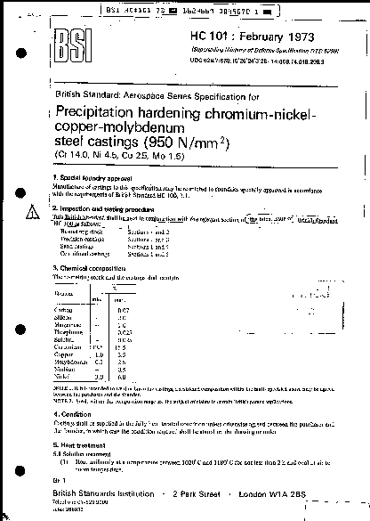 Specification for precipitation hardening chromium-nickel-copper-molybdenum steel castings (950 N/mm2) (Cr 14.0, Ni 4.5, Cu 2.5, Mo 1.5)