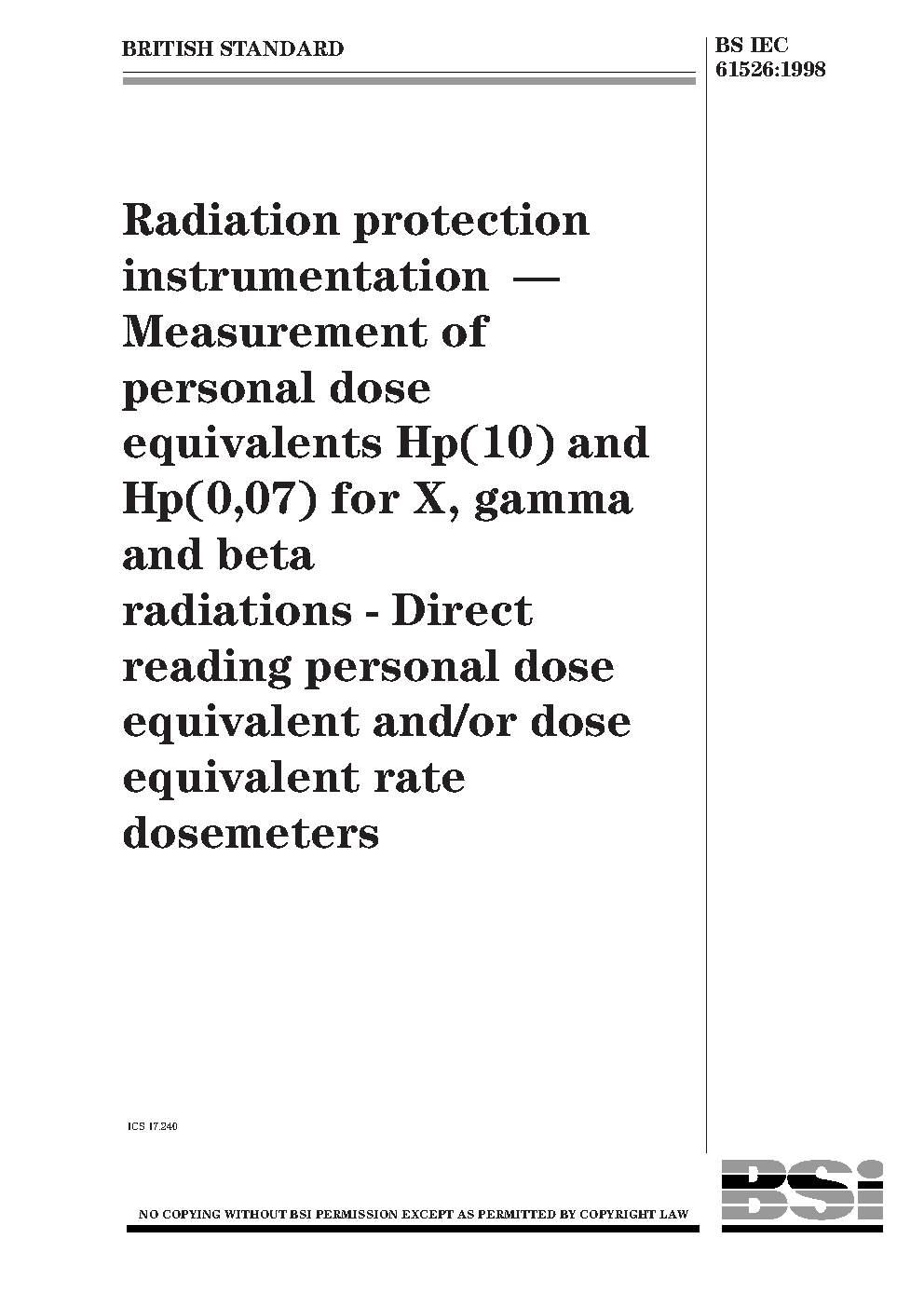 Radiation protection instrumentation. Measurement of personal dose equivalents Hp(10) and Hp(0,07) for X, gamma and beta radiations. Direct reading personal dose equivalent and/or dose equivalent rate dosemeters
