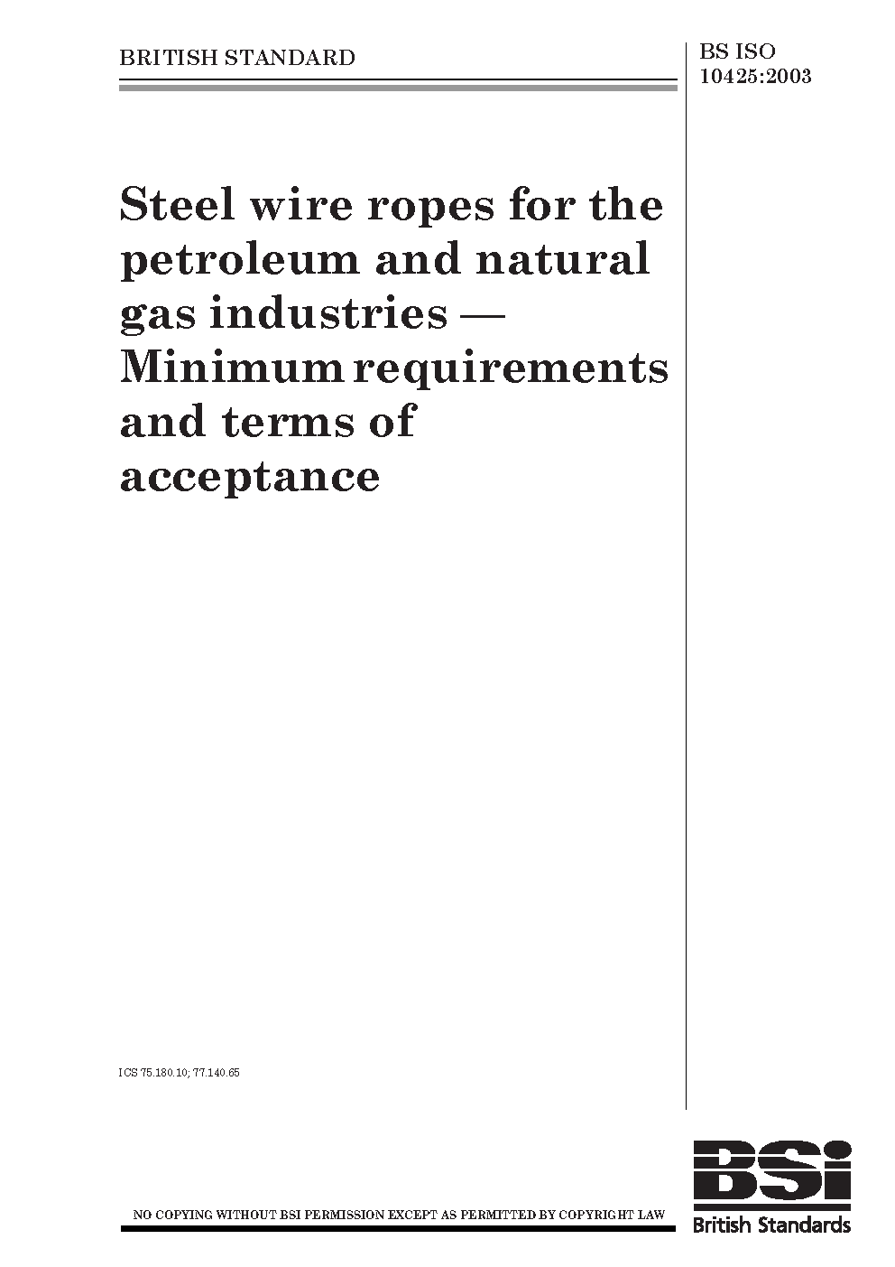 Steel wire ropes for the petroleum and natural gas industries. Minimum requirements and terms of acceptance