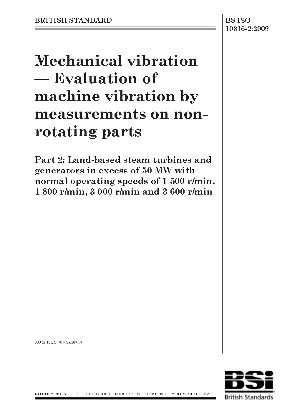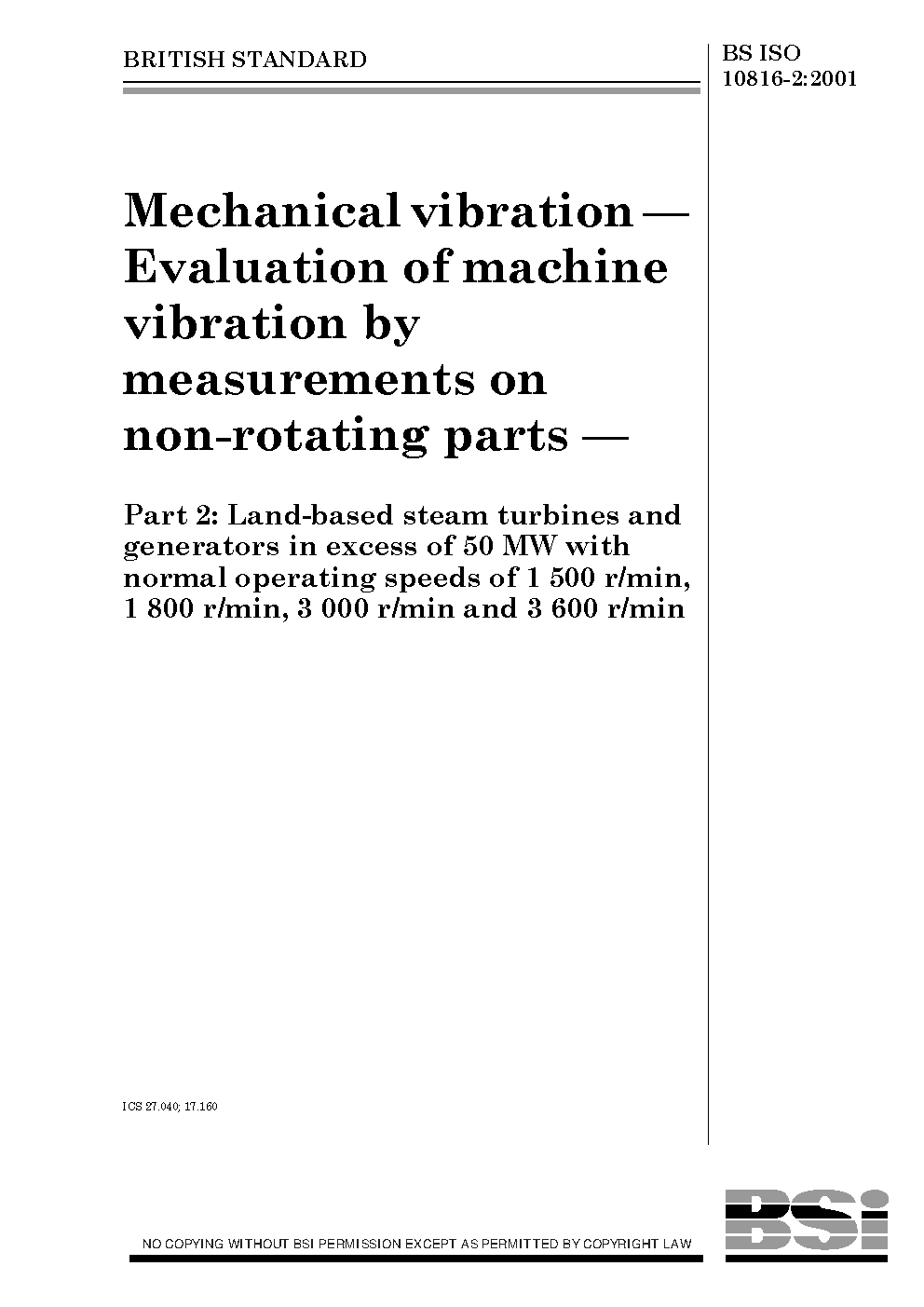 Mechanical vibration. Evaluation of machine vibration by measurements on non-rotating parts Land-based steam turbines and generators in excess 50 MW with normal operating speeds 1500 r/min, 1800 3000 r/min 3600