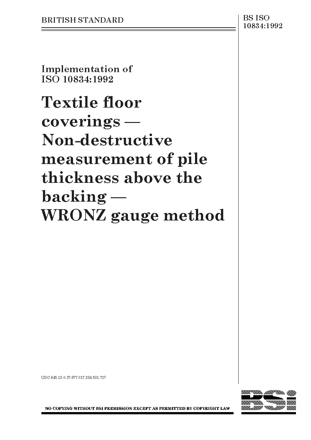 Textile floor coverings. Non-destructive measurement of pile thickness above the backing. WRONZ gauge method