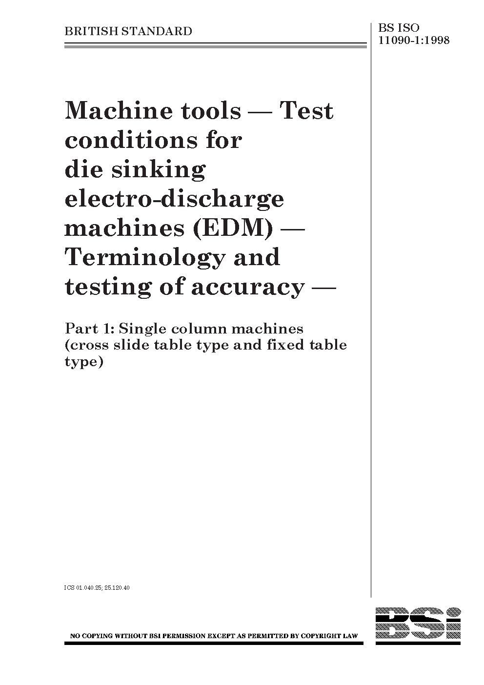 Electric sparks;Reproducibility;Cutting tools;Geometric surfaces;Parallel;Machines working by stock removal;Electric discharges;Straightness measurement;Milling cutters;Production equipment;Length;Fixed;Numerical control;Electrical equipment;Manually-operated devices;Square shape;Terminology;Performance testing;Tolerances of position;Flatness measurement;Test equipment;Dynamic testing;Die-sinking cutters;Testing conditions;Tolerances (measurement);Dimensional measurement;Machine tools;Accuracy;Single