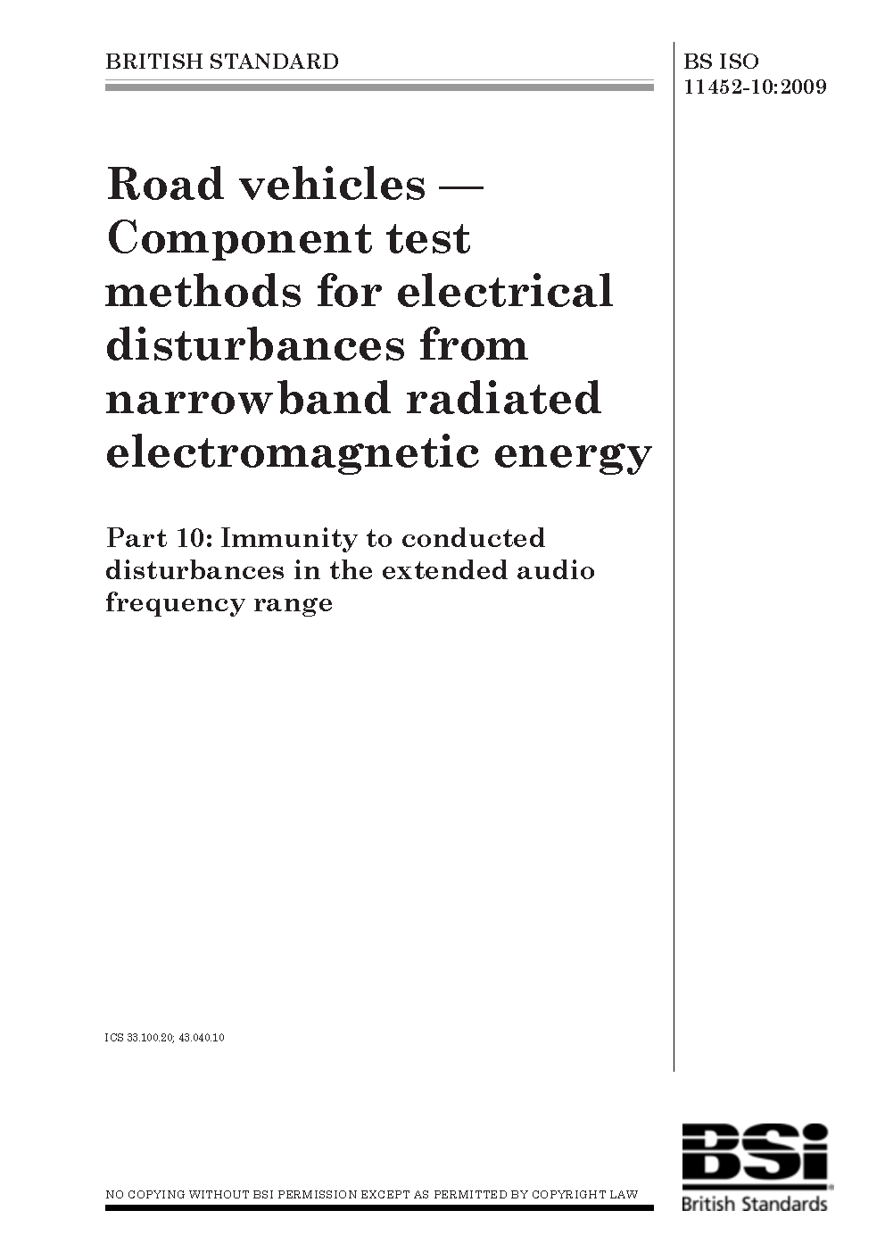 Road vehicles. Component test methods for electrical disturbances from narrowband radiated electromagnetic energy Immunity to conducted in the extended audio frequency range