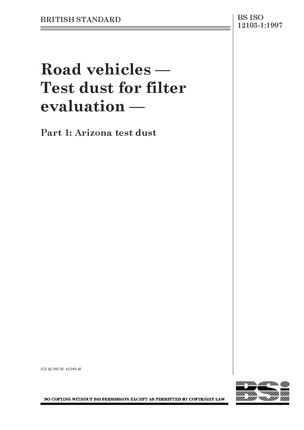 Road vehicles. Test contaminants for filter evaluation Arizona test dust