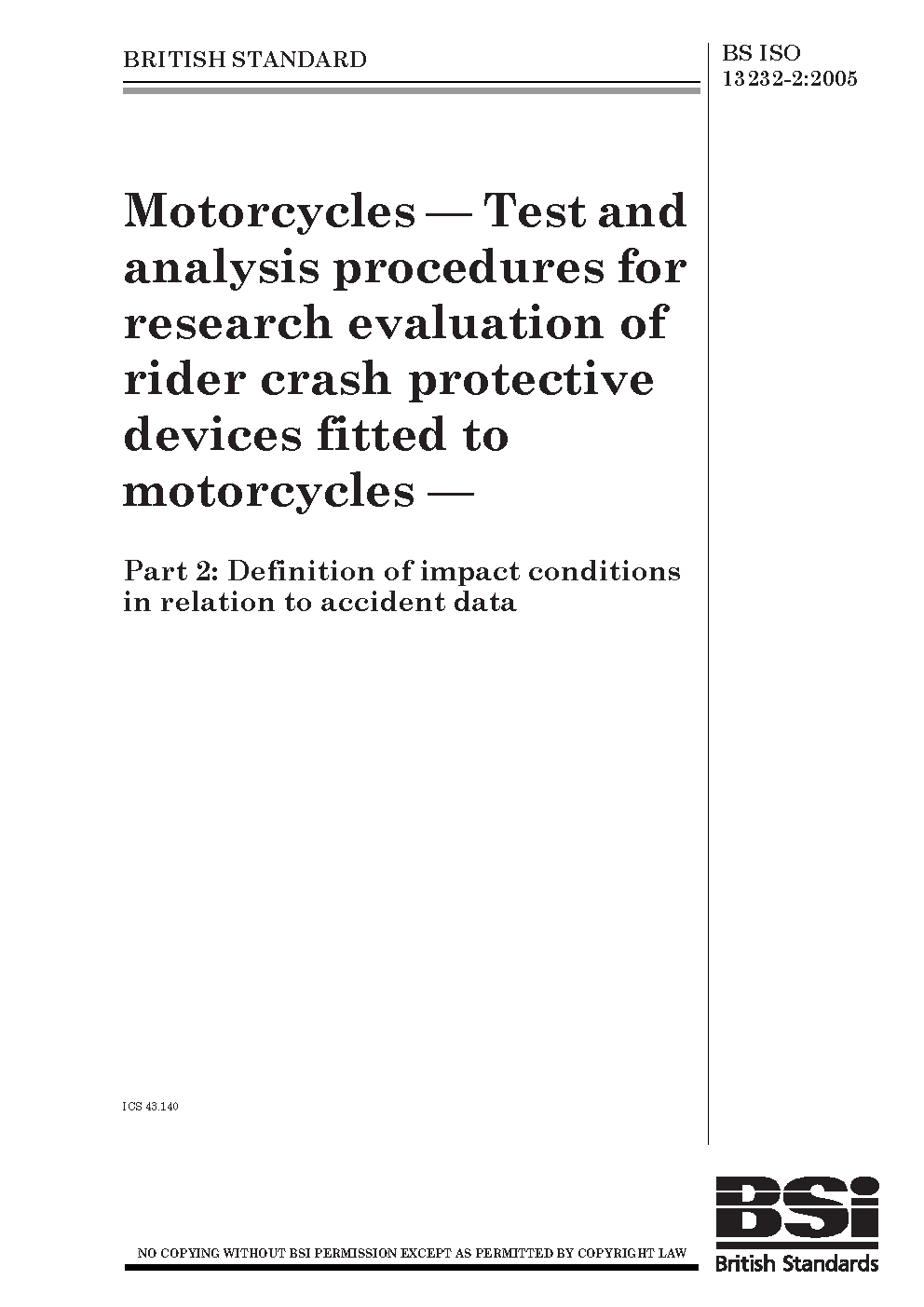 Motorcycles. Test and analysis procedures for research evaluation of rider crash protective devices fitted to motorcycles Definition impact conditions in relation accident data