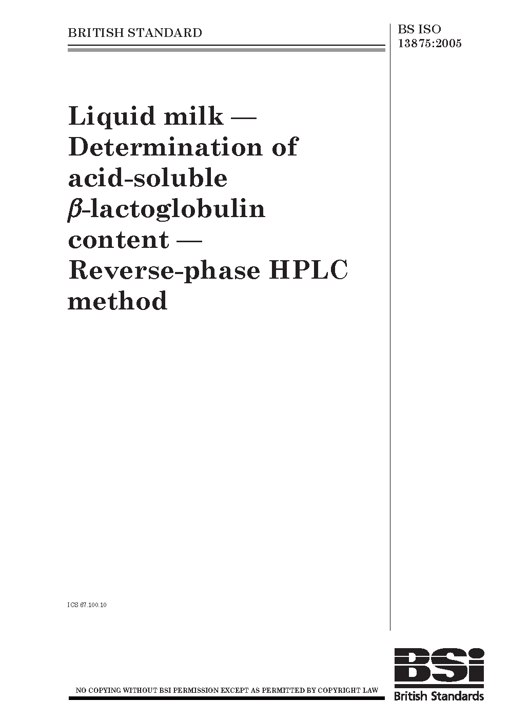 Liquid milk. Determination of acid-soluble ß-lactoglobulin content. Reverse-phase HPLC method