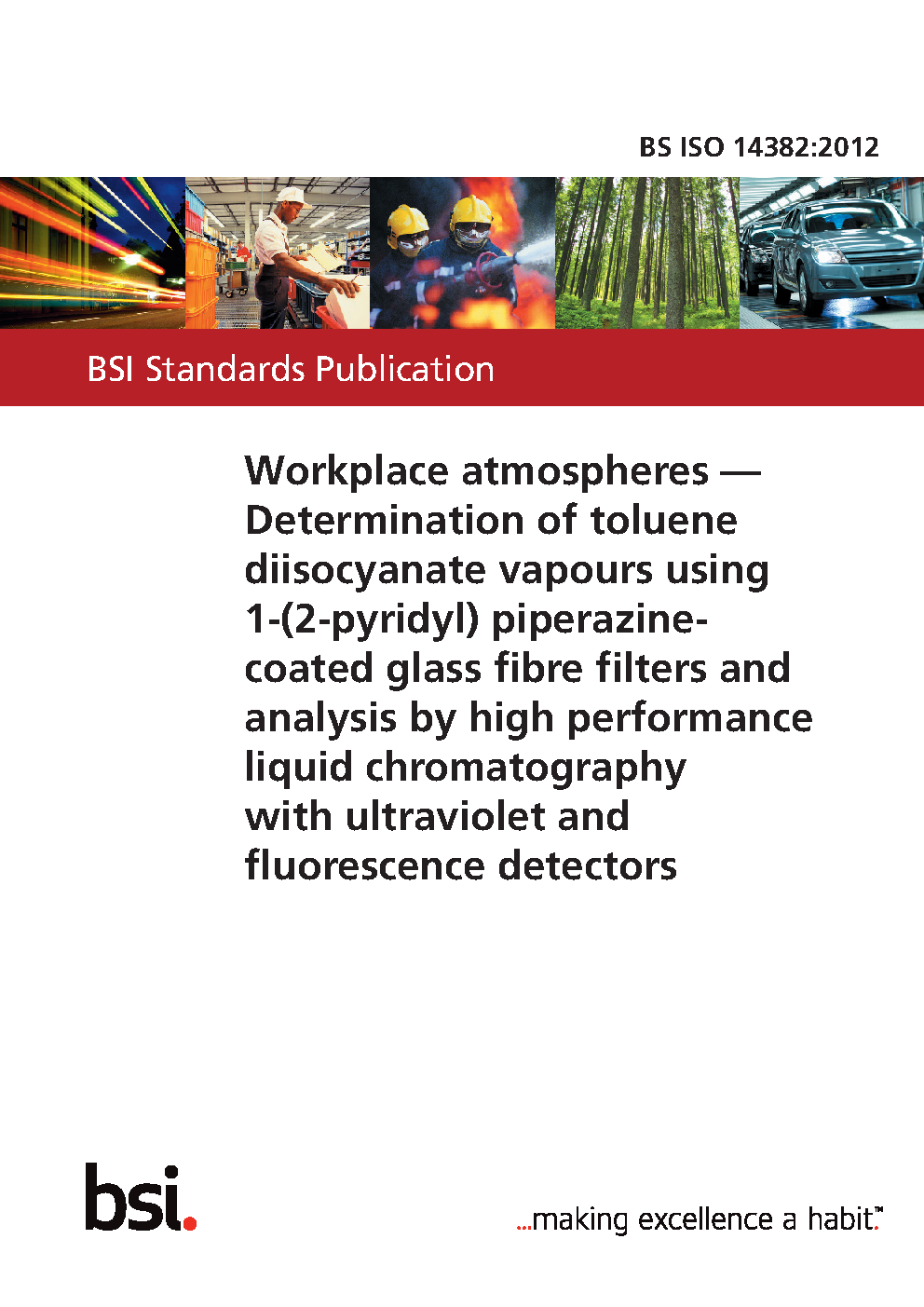 Workplace atmospheres. Determination of toluene diisocyanate vapours using 1-(2-pyridyl) piperazine-coated glass fibre filters and analysis by high performance liquid chromatography with ultraviolet and fluorescence detectors