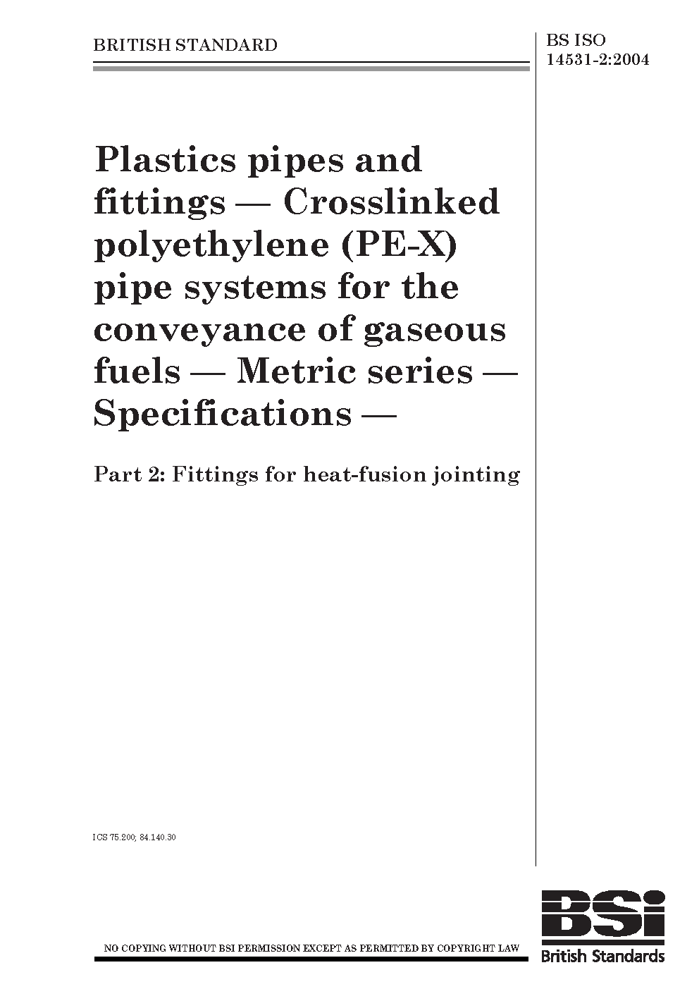 Plastics pipes and fittings. Crosslinked polyethylene (PE-X) pipe systems for the conveyance of gaseous fuels. Metric series. Specifications Fittings heat-fusion jointing