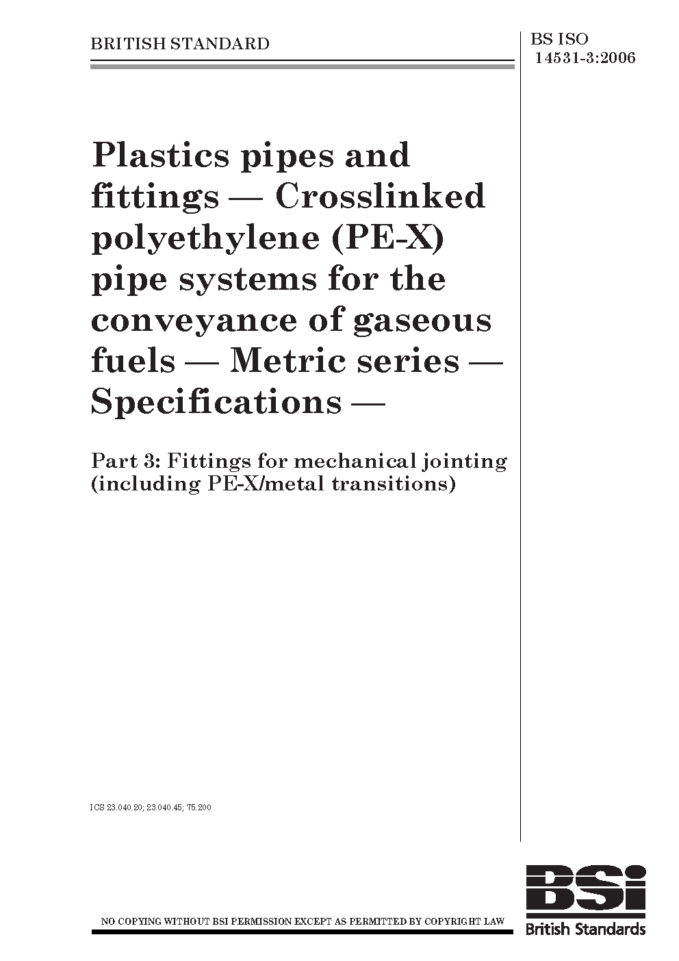 Plastics pipes and fittings. Crosslinked polyethylene (PE-X) pipe systems for the conveyance of gaseous fuels. Metric series. Specifications Fittings mechanical jointing (including PE-X/metal transitions)