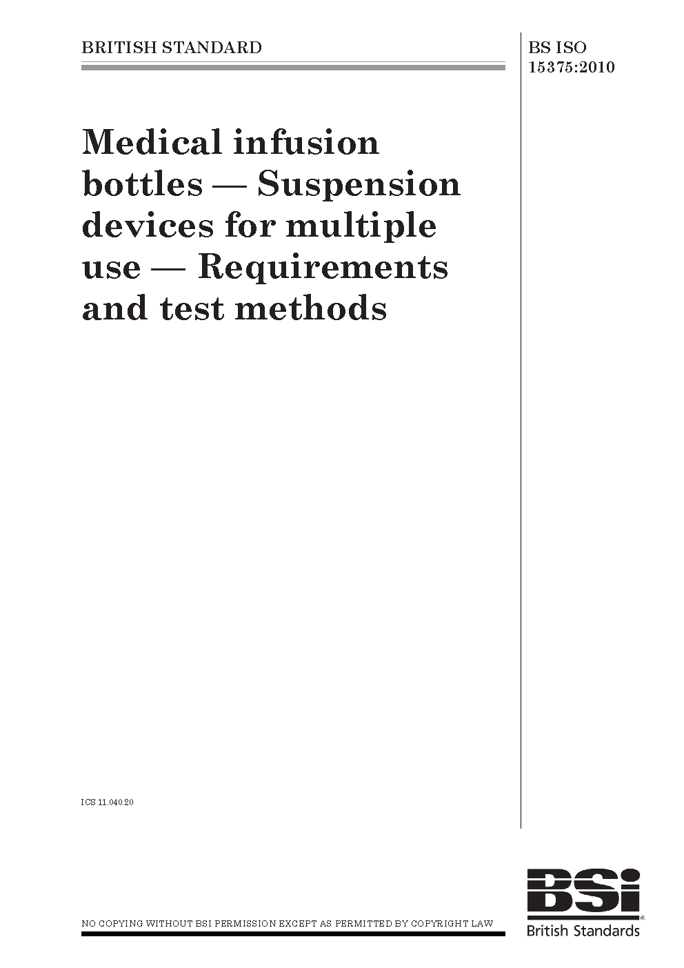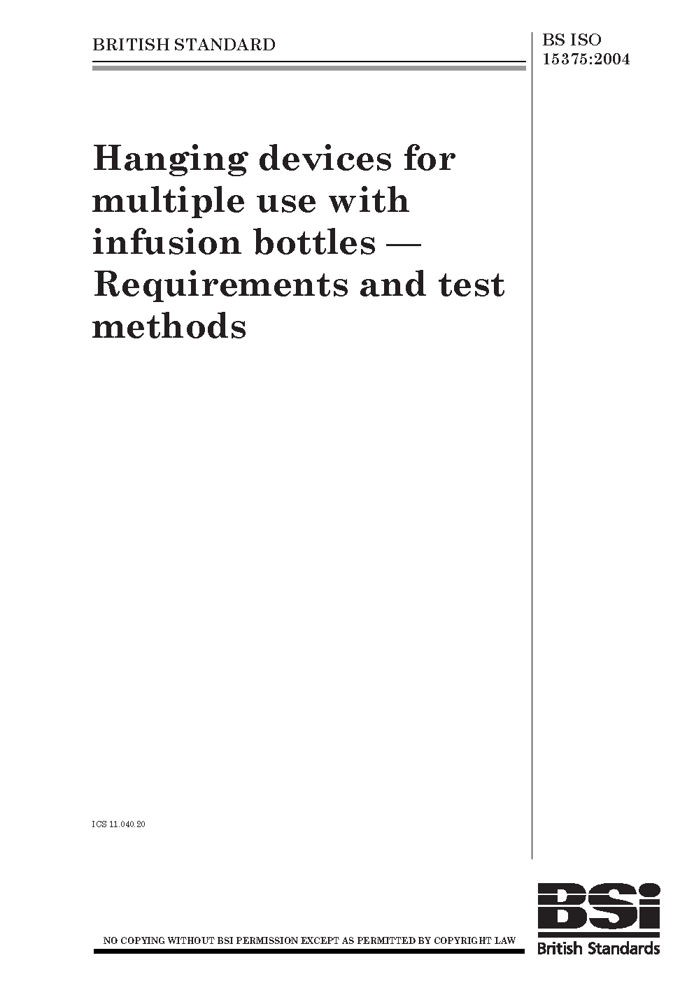 Hanging devices for multiple use with infusion bottles. Requirements and test methods
