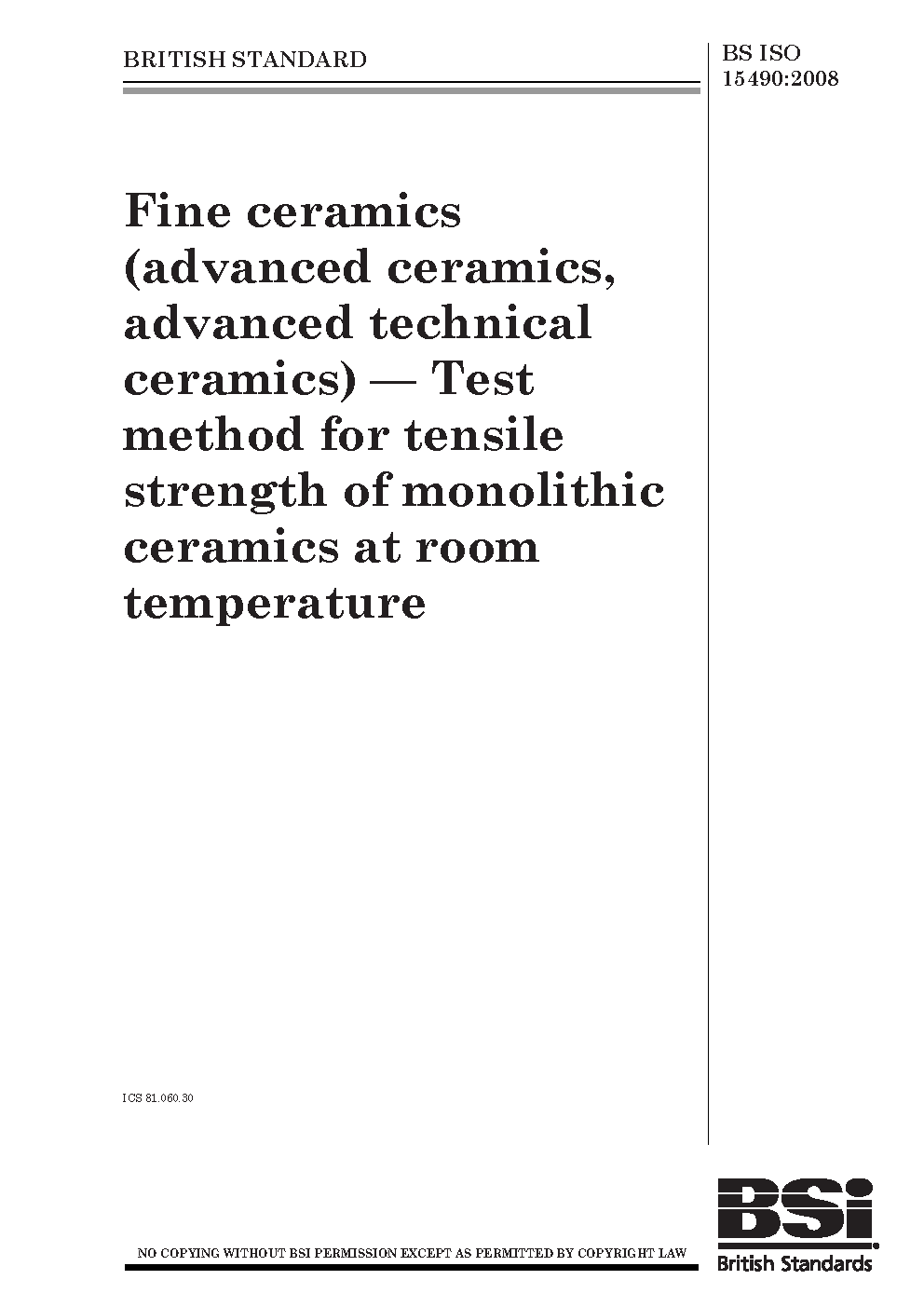 Fine ceramics (advanced ceramics, advanced technical ceramics). Test method for tensile strength of monolithic ceramics at room temperature