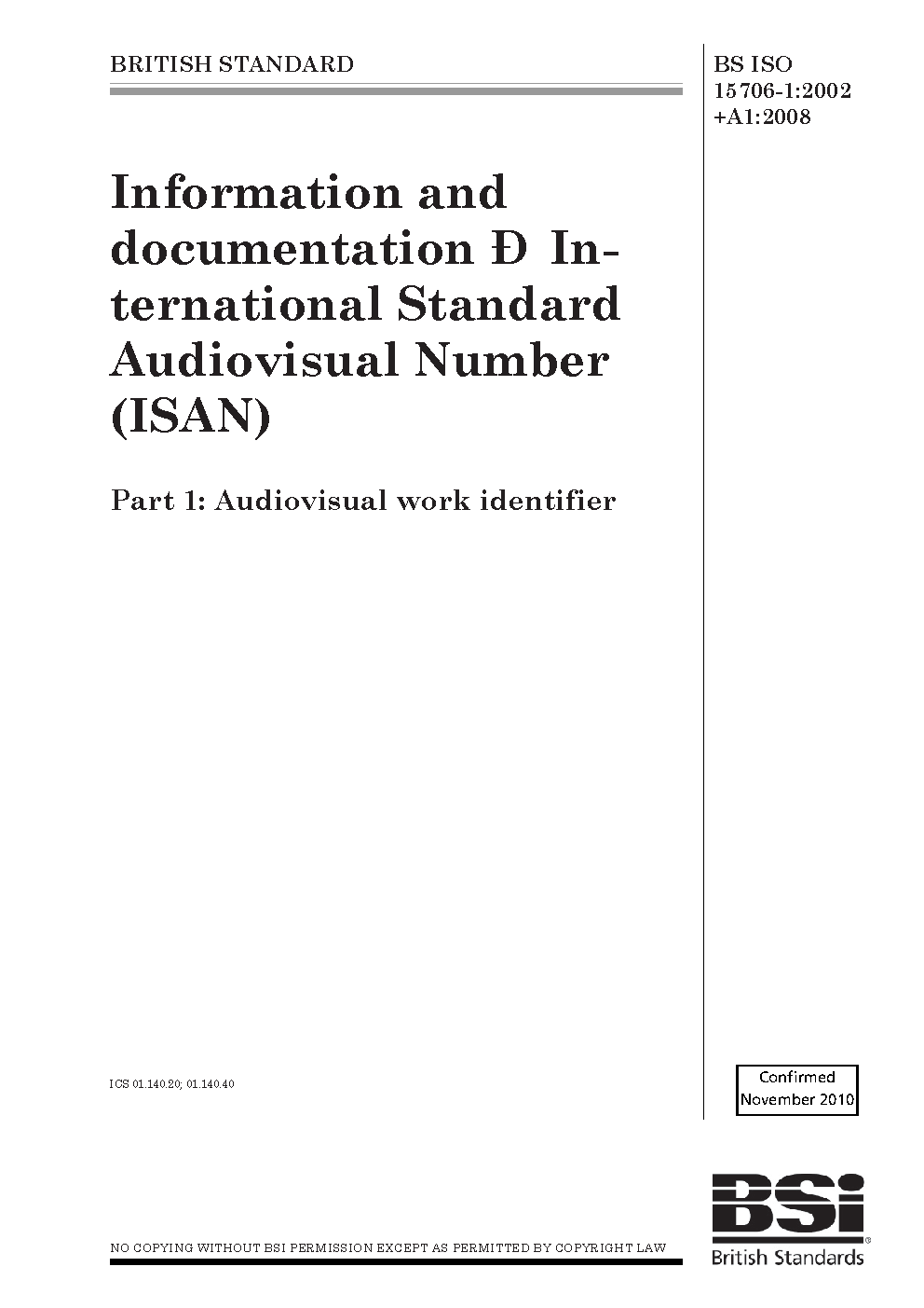 Information and documentation. International Standard Audiovisual Number (ISAN) work identifier