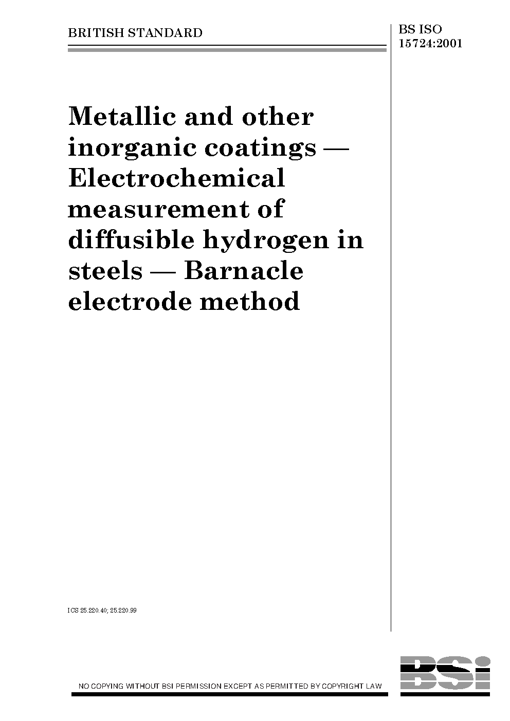 Metallic and other inorganic coatings. Electrochemical measurement of diffusible hydrogen in steels. Barnacle electrode method