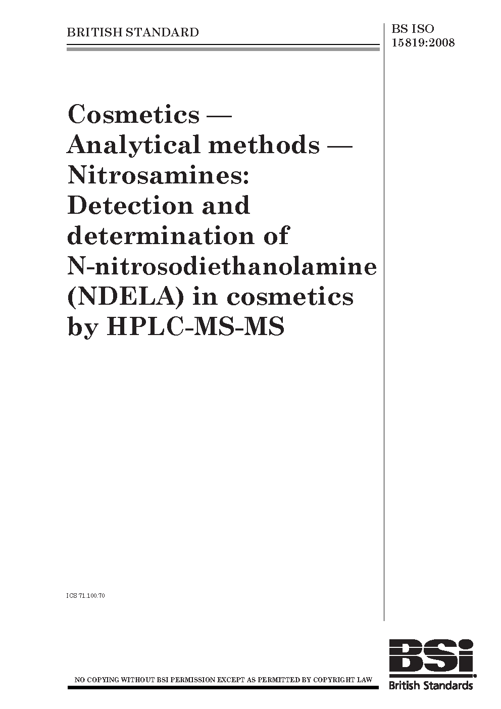 Cosmetics. Analytical methods. Nitrosamines. Detection and determination of N-nitrosodiethanolamine (NDELA) in cosmetics by HPLC-MS-MS