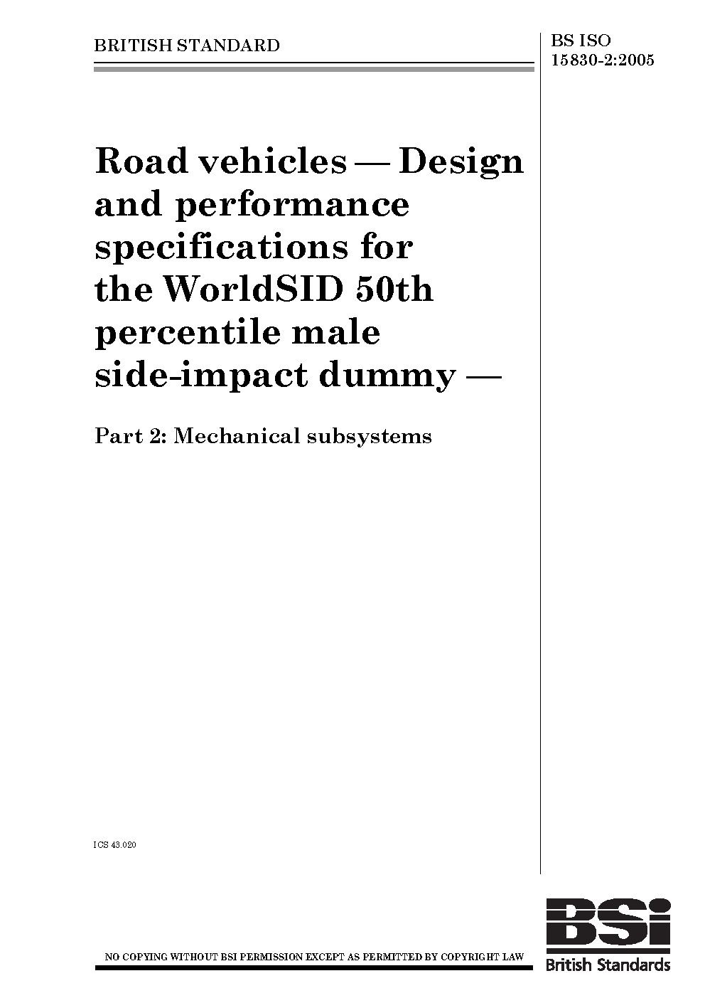 Road vehicles. Design and performance specifications for the WorldSID 50th percentile male side-impact dummy Mechanical subsystems