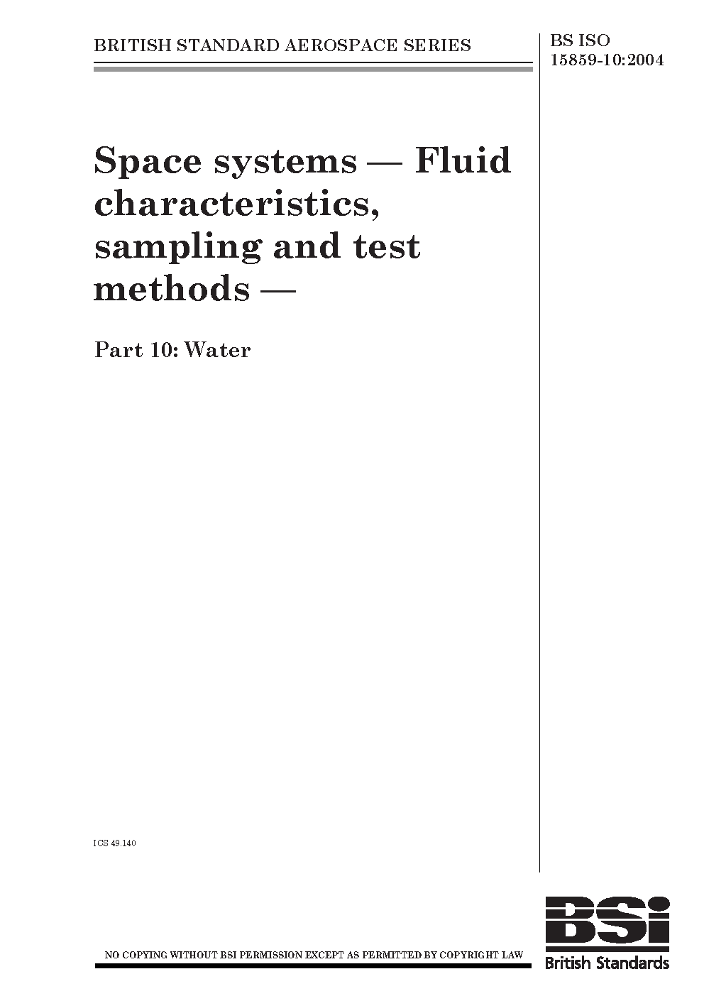 Aerospace series. Space systems. Fluid characteristics, sampling and test methods Water