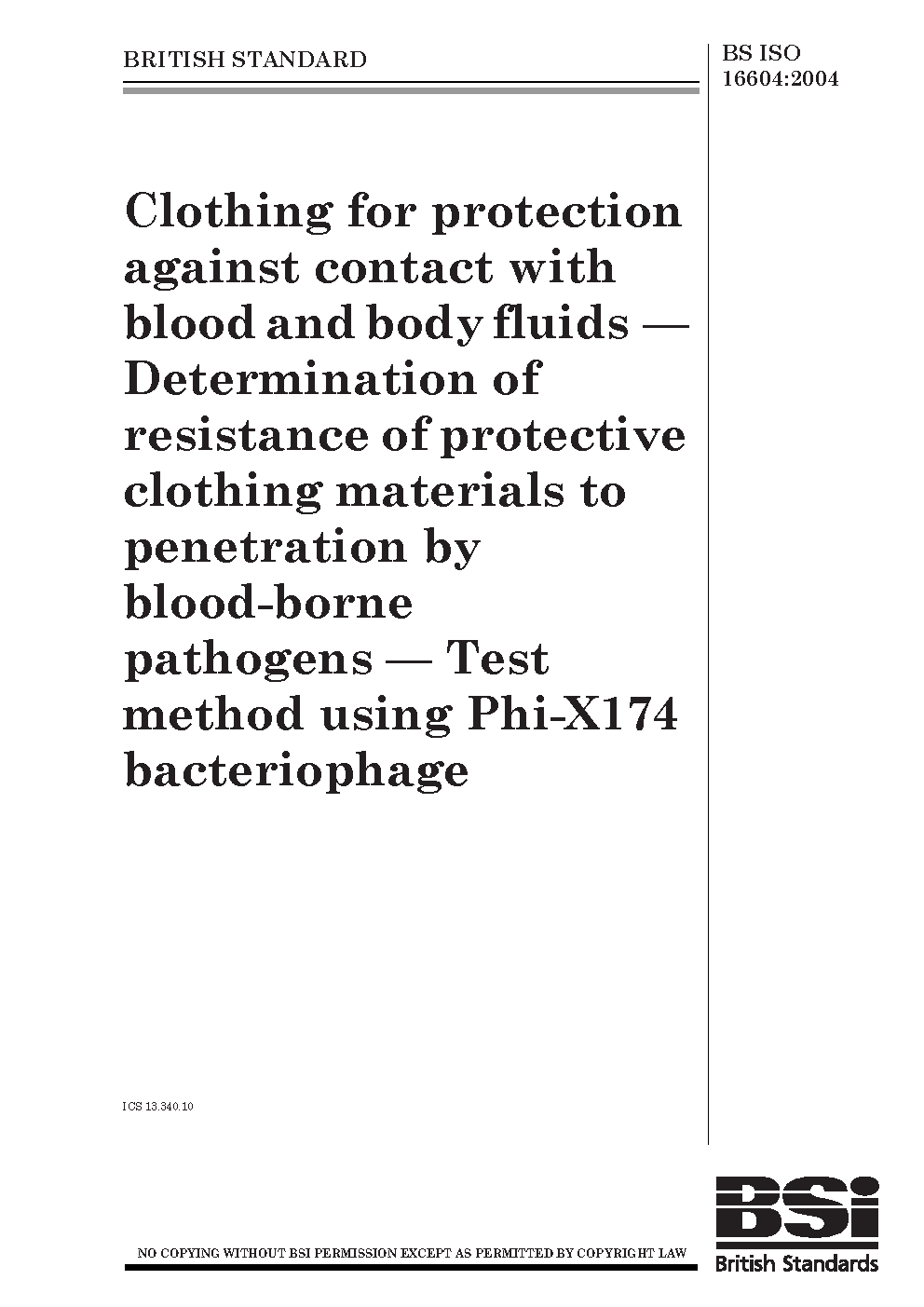 Clothing for protection against contact with blood and body fluids. Determination of resistance of protective clothing materials to penetration by blood-borne pathogens. Test method using Phi-X174 Bacteriophage