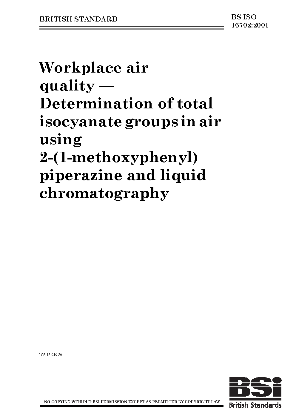 Workplace air quality. Determination of total organic isocyanate groups in air using 1-(2-methoxyphenyl) piperazine and liquid chromatography