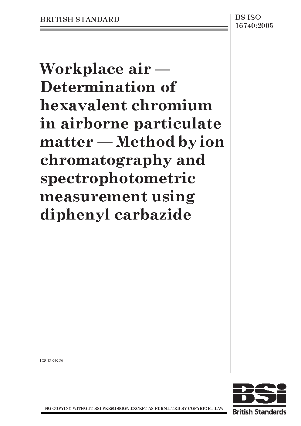 Workplace air. Determination of hexavalent chromium in airborne particulate matter. Method by ion chromatography and spectrophotometric measurement using diphenyl carbazide