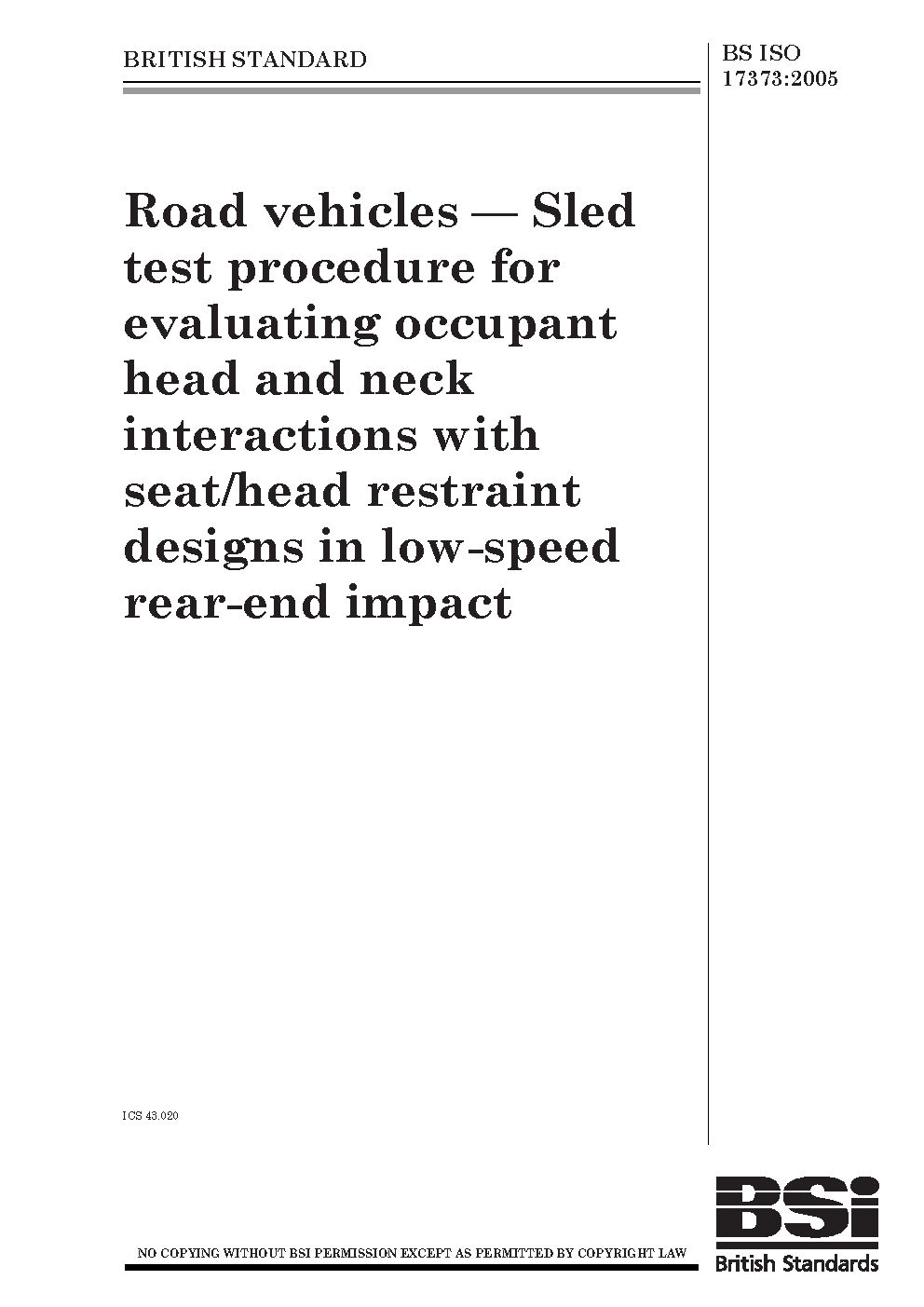 Road vehicles. Sled test procedure for evaluating occupant head and neck interactions with seat/head restraint designs in low-speed rear-end impact