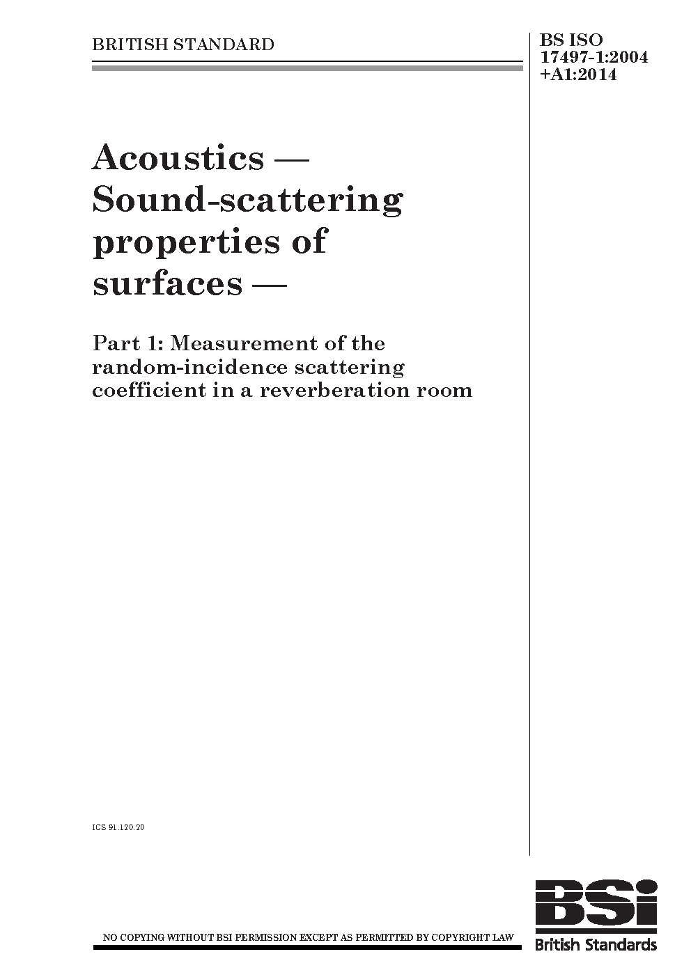 Acoustics. Sound-scattering properties of surfaces Measurement the random-incidence scattering coefficient in a reverberation room