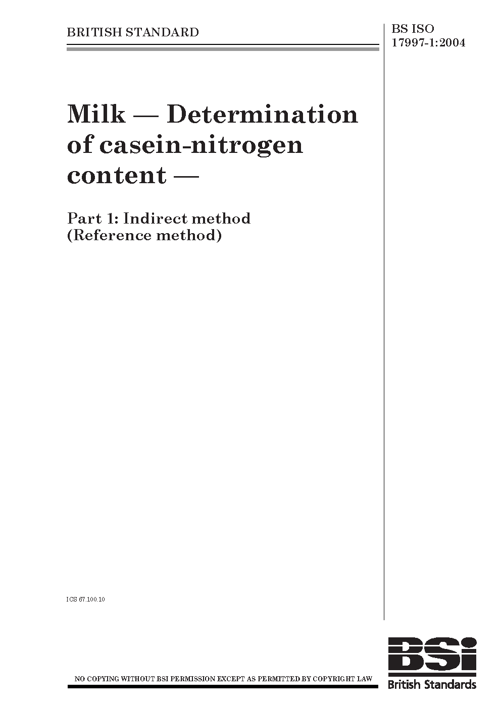 Milk. Determination of casein-nitrogen content Indirect method (Reference method)
