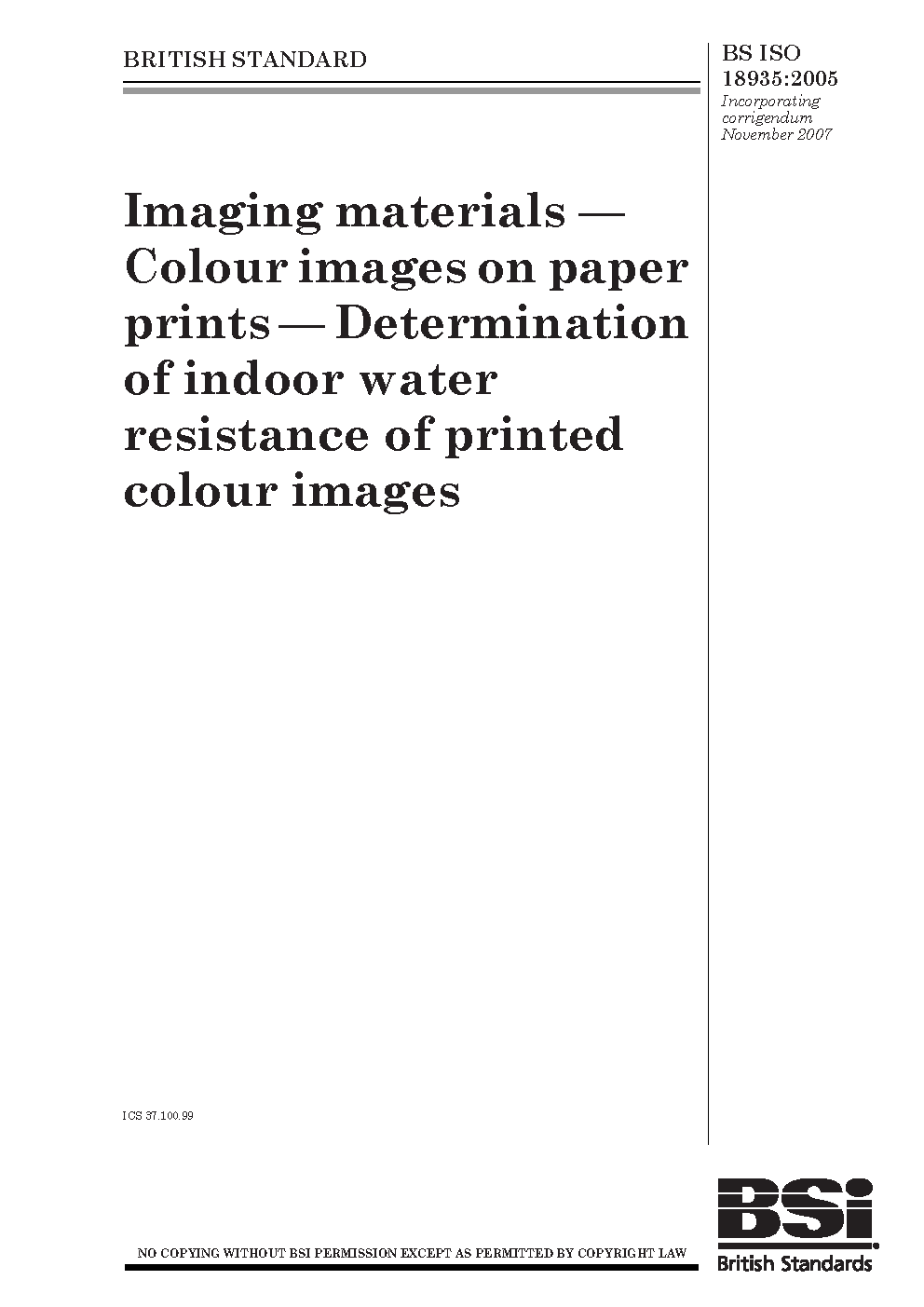 Imaging materials. Colour images. Determination of water resistance of printed colour images