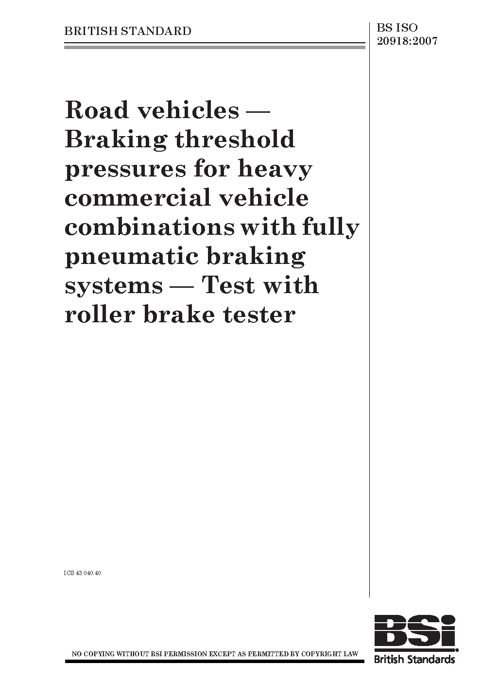 Road vehicles. Braking threshold pressures for heavy commercial vehicle combinations with fully pneumatic braking systems. Test with roller brake tester