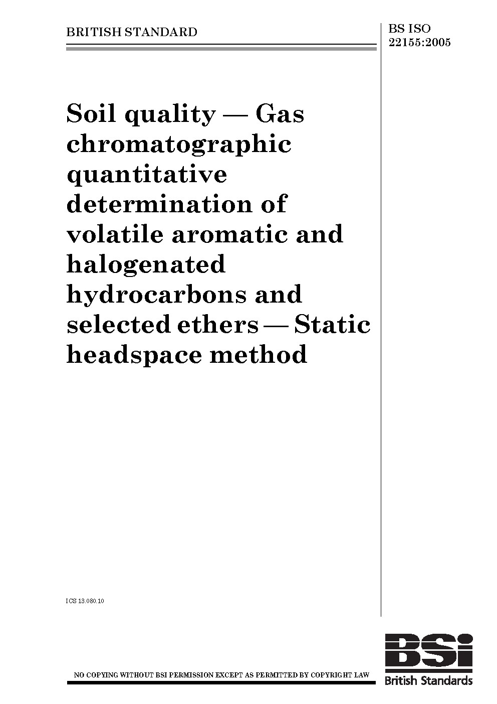 Soil quality. Gas chromatographic quantitative determination of volatile aromatic and halogenated hydrocarbons and selected ethers. Static headspace method