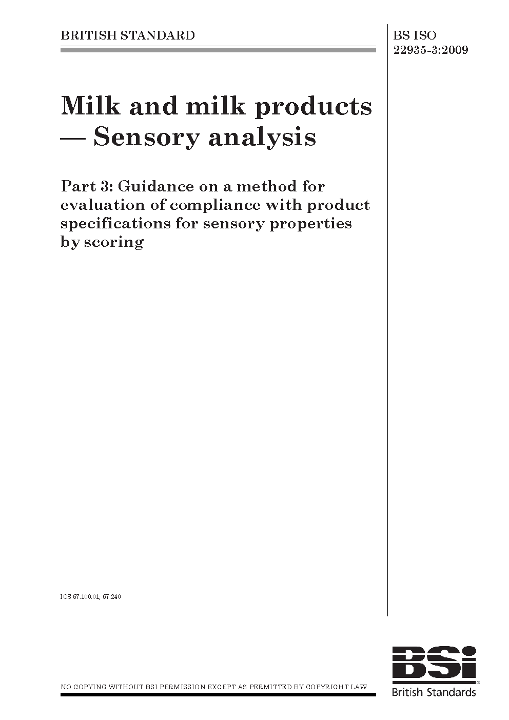 Milk and milk products. Sensory analysis Guidance on a method for evaluation of compliance with product specifications sensory properties by scoring