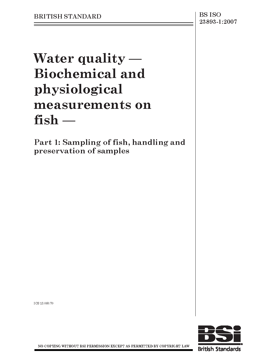 Water quality. Biochemical and physiological measurements on fish Sampling of fish, handling preservation samples